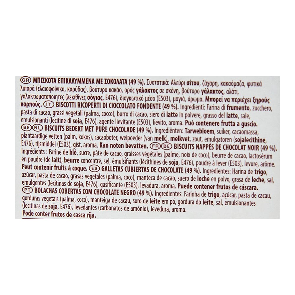 Farine de BLÉ, sucre, pâte de cacao, graisses végétales (palme, noix de coco), beurre de cacao, lactosérum en poudre (de LAIT), BEURRE concentré, sel, émulsifiants (lécithine de SOJA, E476), poudre à lever (E503), levure, arôme.
