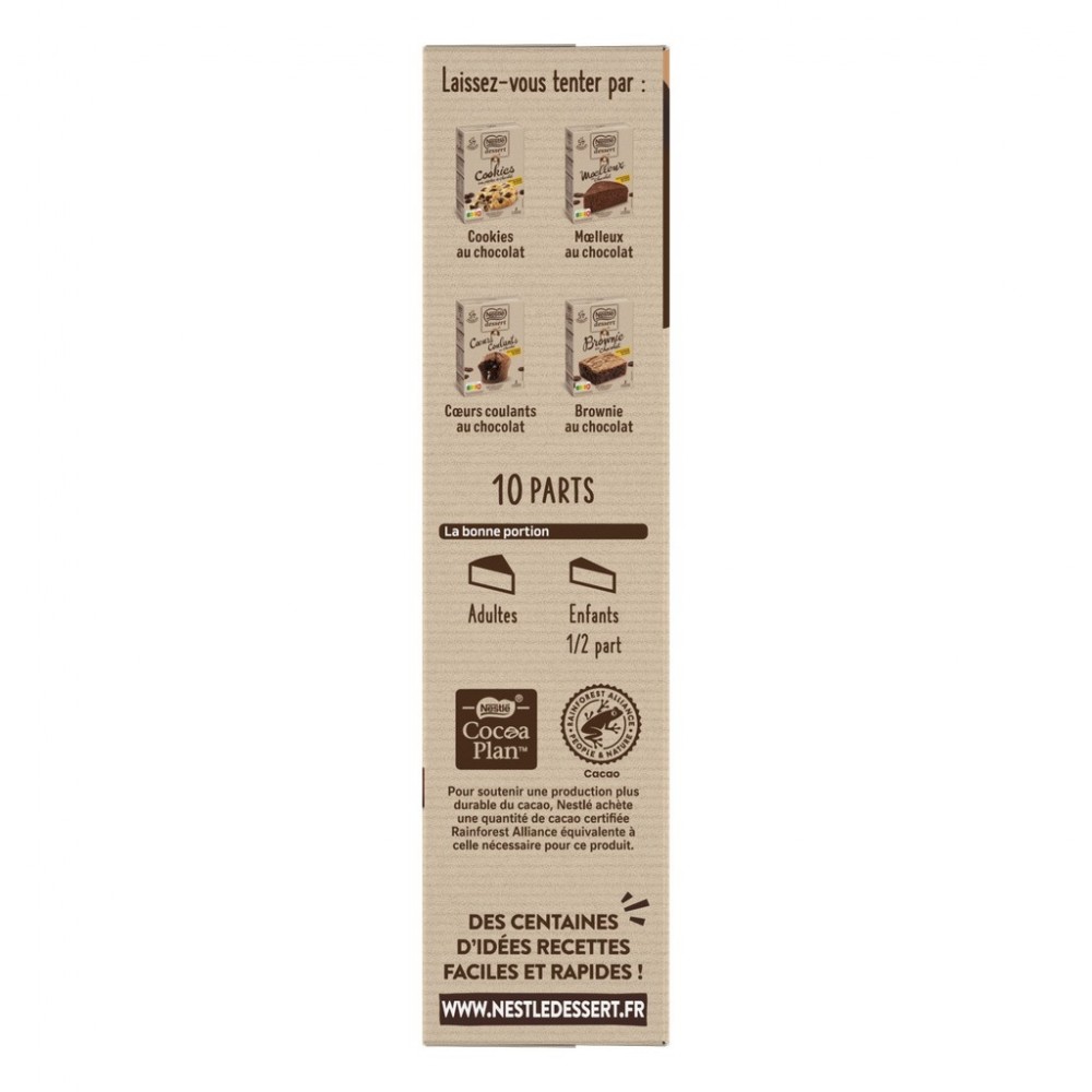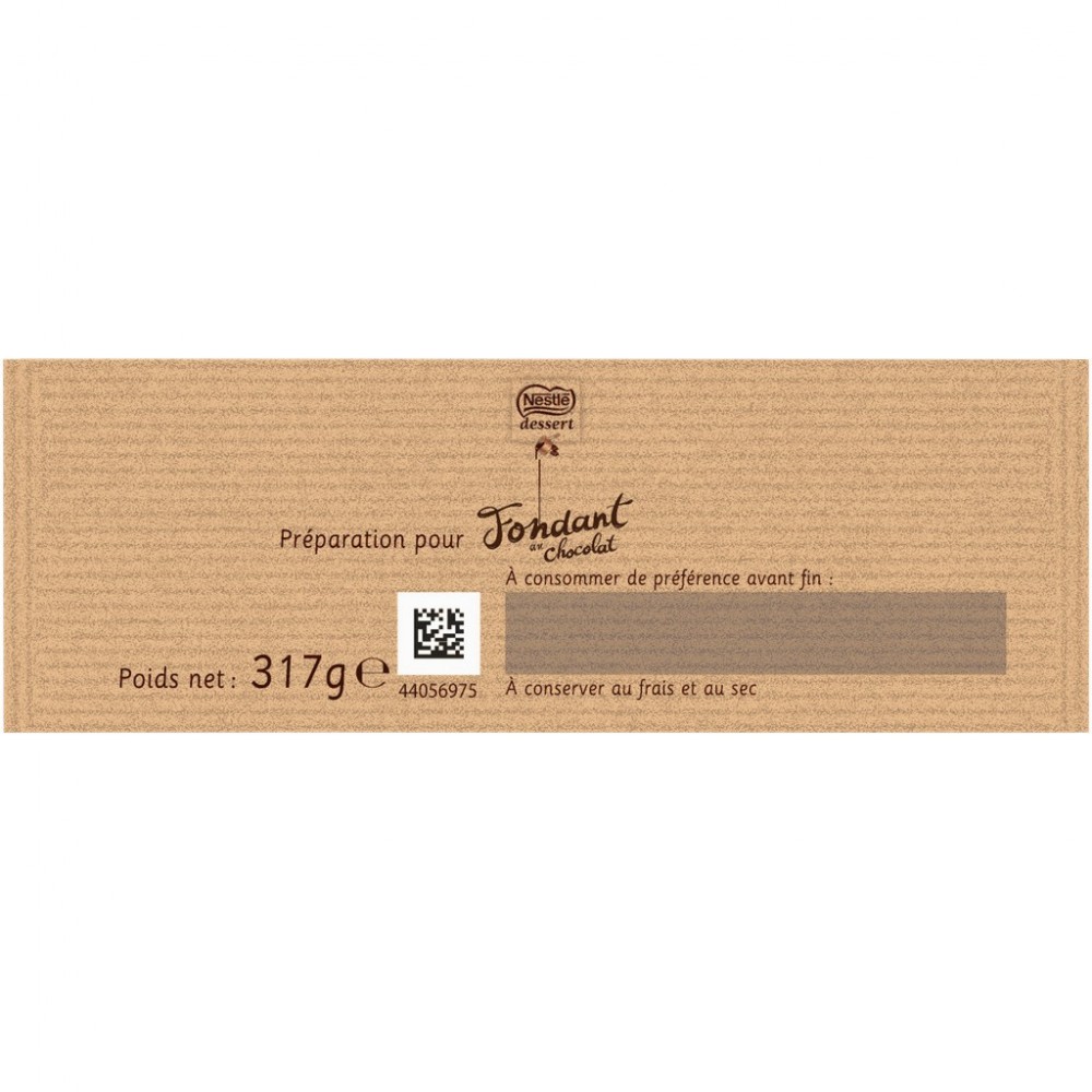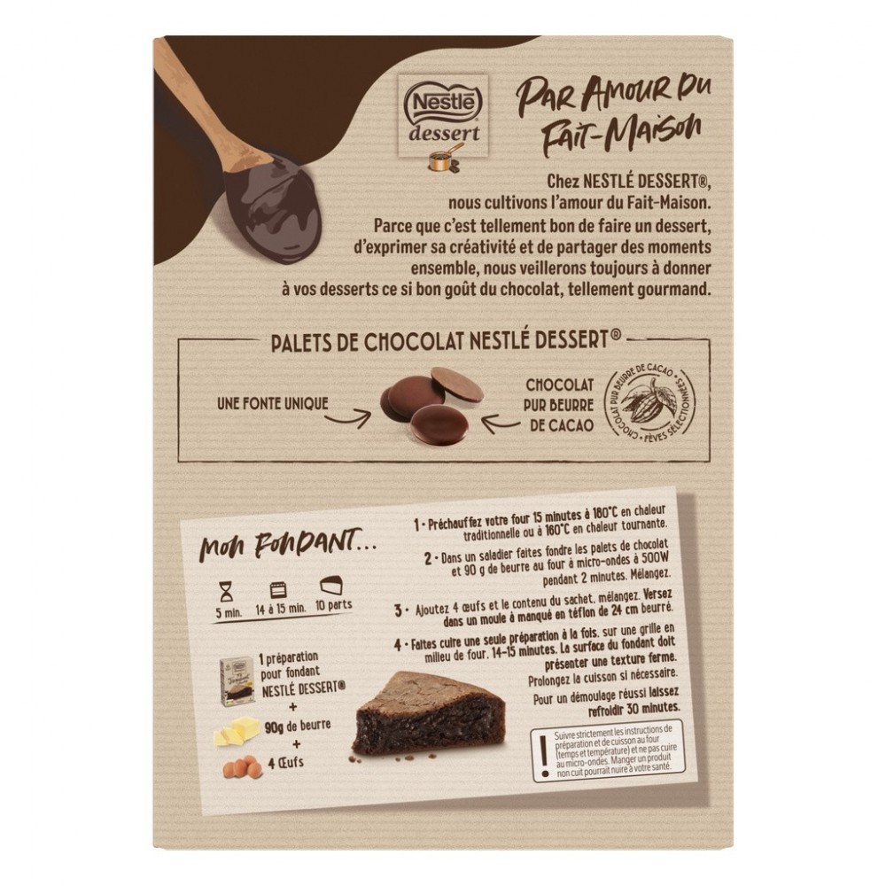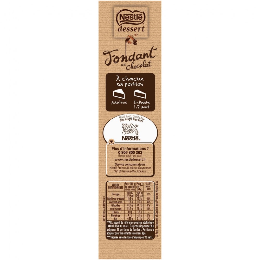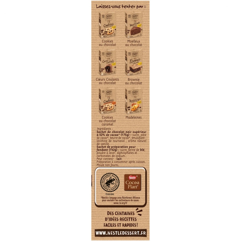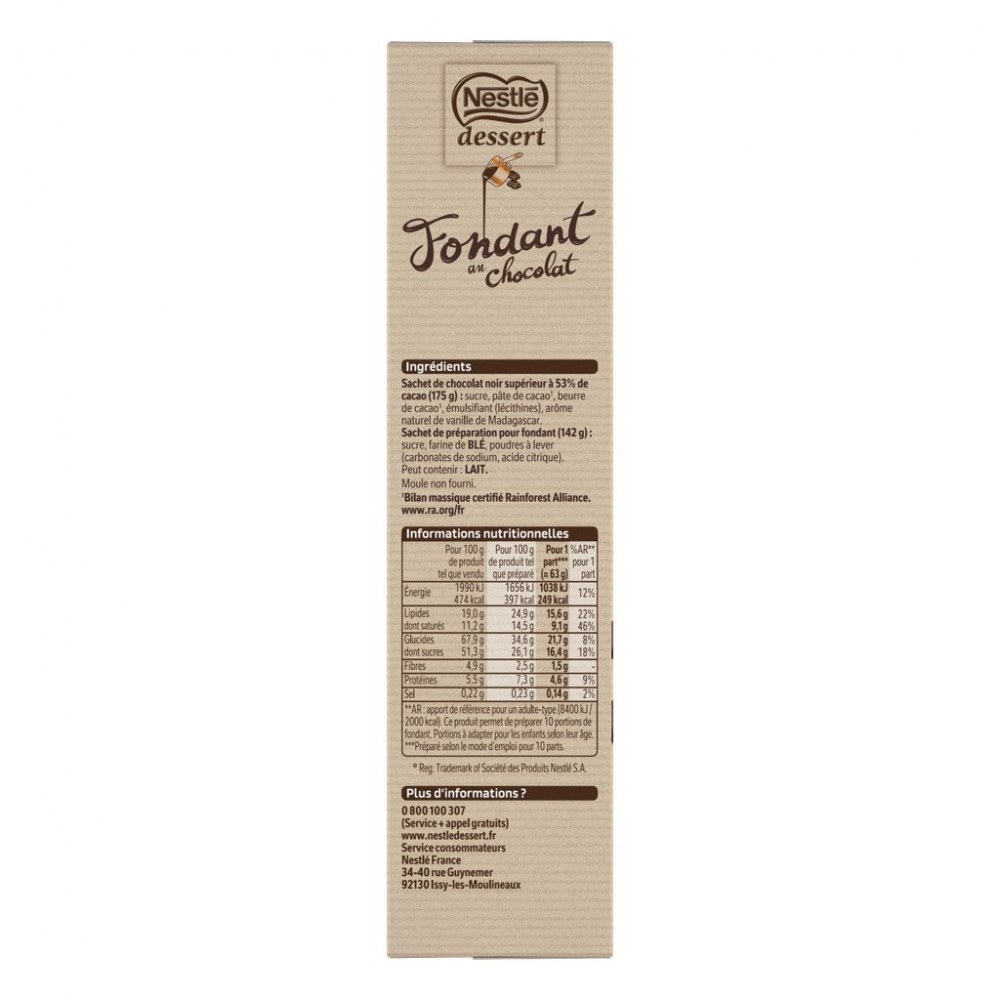 Ingrédients : Sachet de chocolat noir supérieur à 53% de cacao (175 g) : sucre, pâte de cacao¹, beurre de cacao¹, émulsifiant (lécithines), arôme naturel de vanille de Madagascar. Sachet de préparation pour fondant (142 g) : sucre, farine de BLÉ, poudres à lever (carbonates de sodium, acide citrique). Peut contenir : LAIT. ¹Bilan massique certifié Rainforest Alliance. www.ra.org/fr. Pour soutenir une production plus durable du cacao, Nestlé achète une quantité de cacao certifiée Rainforest Alliance équivalente à celle nécessaire pour ce produit.