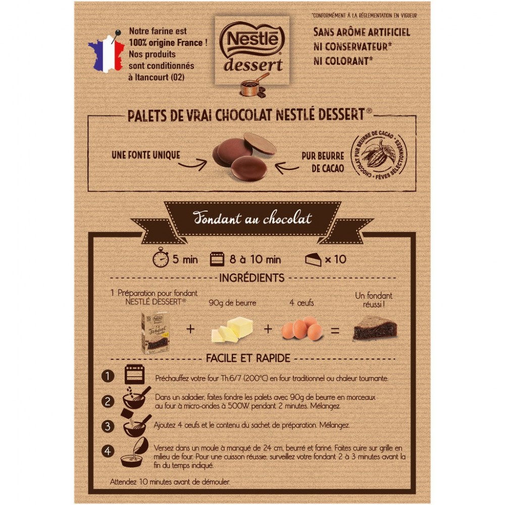 Les préparations pour gâteaux NESTLE DESSERT c'est l'alliance de vrais palets de chocolat NESTLE DESSERT à faire fondre et d'un sachet de préparation aux ingrédients pré-dosés pour des gâteaux gourmands, rapides et faciles à réaliser. NESTLE DESSERT, un chocolat 100% pur beurre de cacao, à la fonte unique, préparé avec soin à partir de fèves sélectionnées.