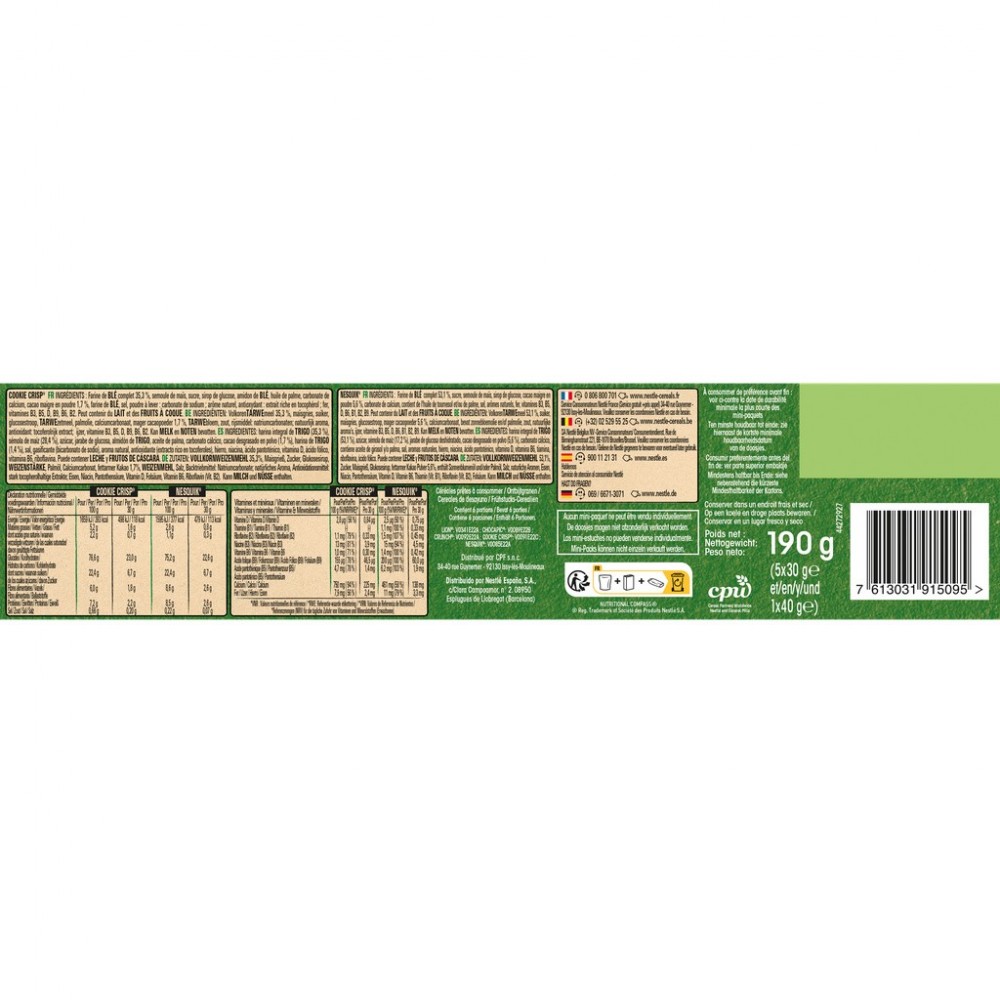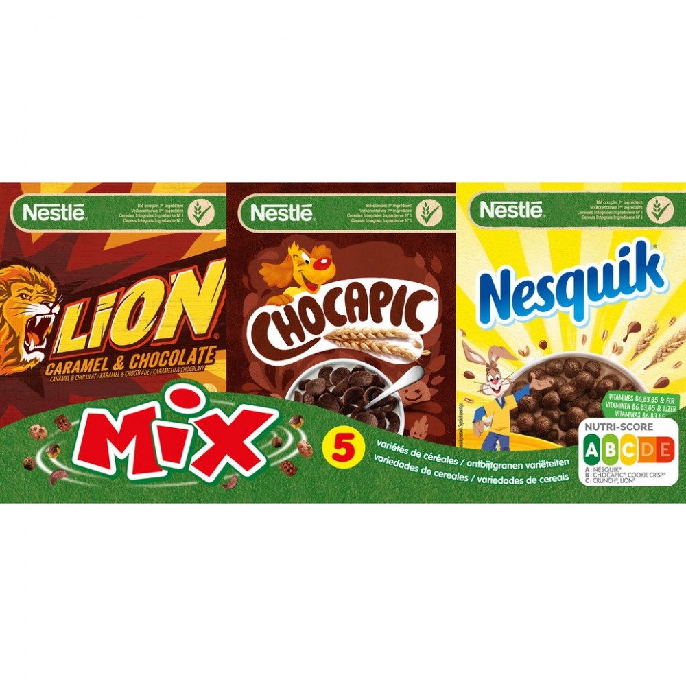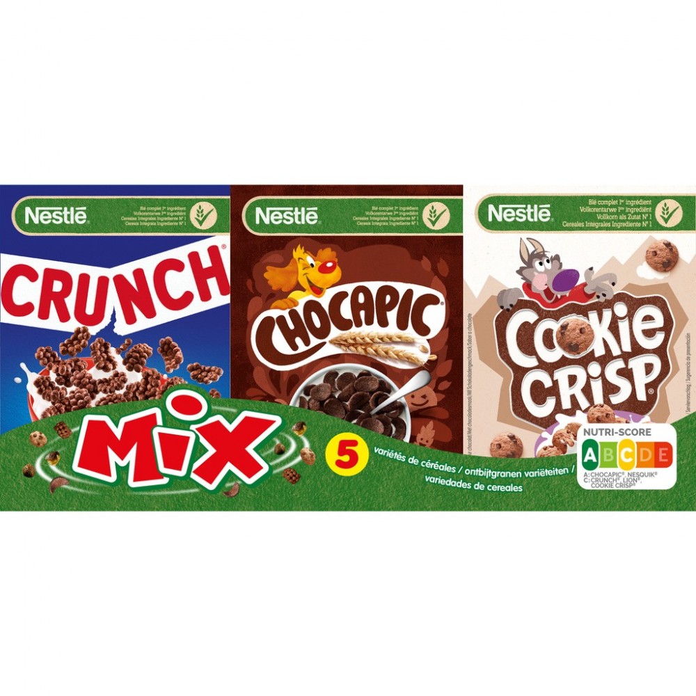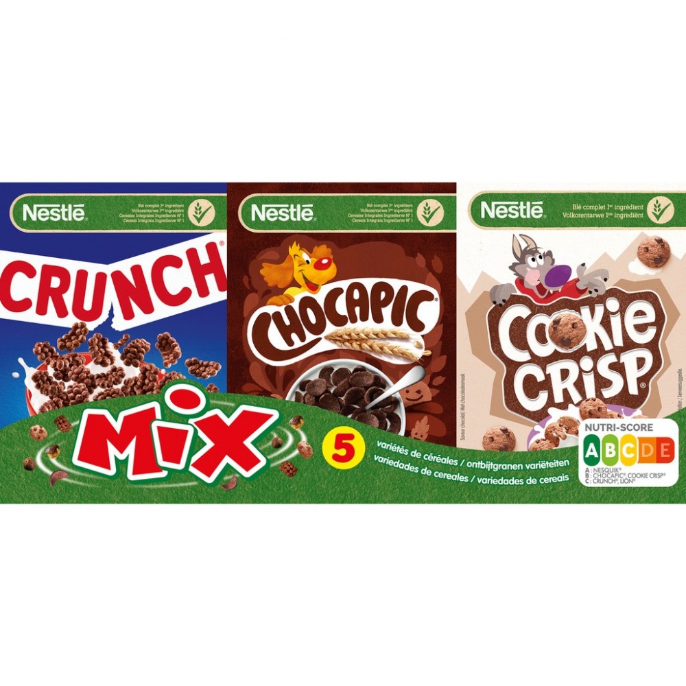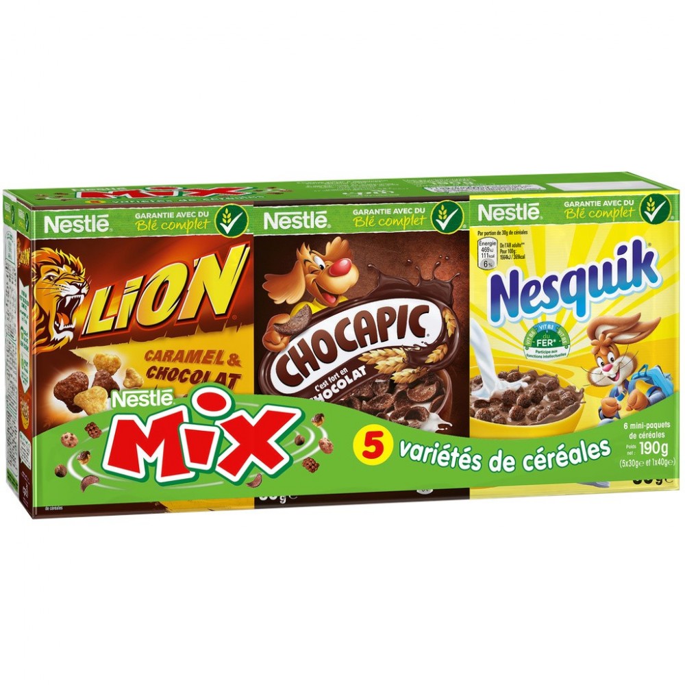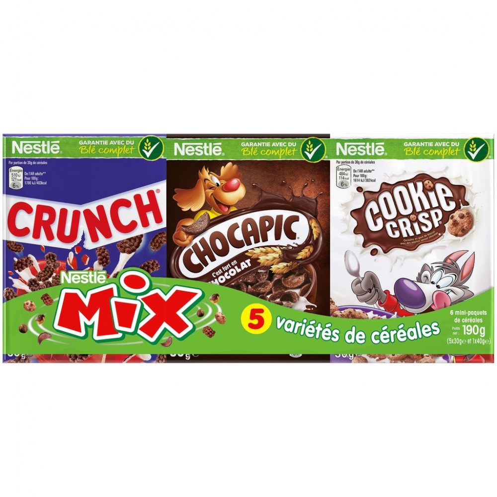 NESTLE MIX, un assortiment de 6 mini paquets de céréales pour diversifier chaque jour les plaisirs du petit-déjeuner. Il contient vos céréales préférées CHOCAPIC x 2, LION x 1, NESQUIK x 1, CRUNCH x 1 et COOKIE CRISP x 1. Pour un petit-déjeuner complet, accompagnez vos céréales de 125ml de lait demi-écrémé et d'un fruit frais.