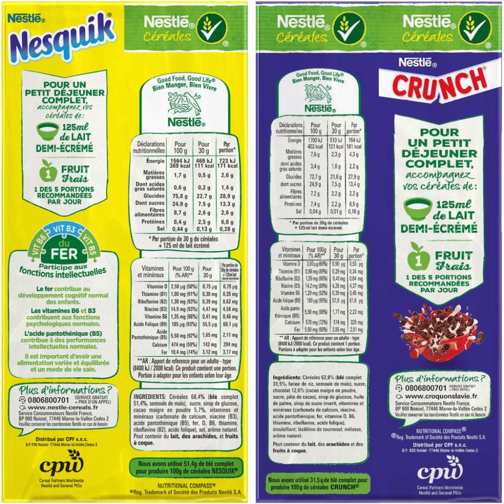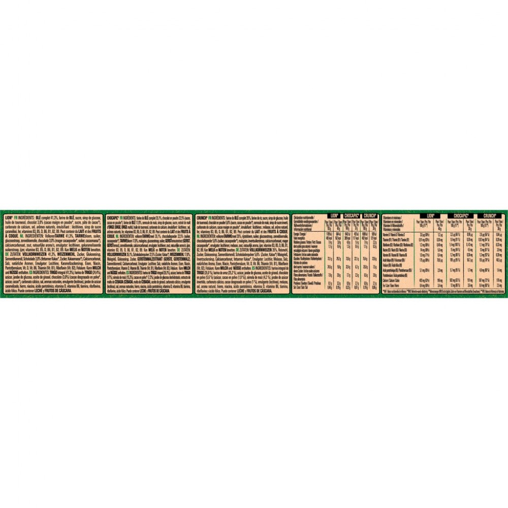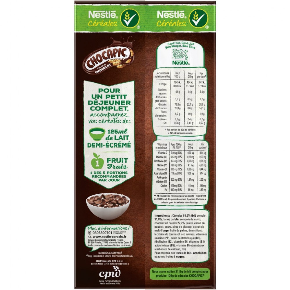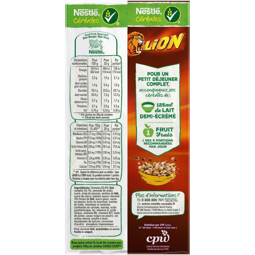 Ingrédients: Lion : BLE complet 41,3%, farine de BLE, sucre, sirop de glucose, huile de tournesol, chocolat 3,0% (cacao maigre en poudre*, sucre, pâte de cacao*), carbonate de calcium, sel, arômes naturels, émulsifiant : lécithines, sirop de sucre caramélisé, fer, vitamines B3, B5, D, B6, B1, B2, B9. Peut contenir du LAIT et FRUITS A COQUE. Chocapic : Farine de BLE complet 35,1%, chocolat en poudre 22,5% (sucre, cacao en poudre*), farine de BLE 17%, semoule de maïs, sirop de glucose, sucre, extrait de malt d'ORGE (ORGE, ORGE malté), huile de tournesol, carbonate de calcium, émulsifiant : lécithines ; sel, arômes naturels, fer, vitamines B3, B5, D, B6, B1, B2 et B9. Peut contenir du LAIT, FRUITS A COQUE. Crunch : BLE complet 35%, farine de riz, sucre, sirop de glucose, huile de tournesol, chocolat en poudre 5,6% (sucre, cacao en poudre*), semoule de maïs, sirop de sucre inverti, carbonate de calcium, cacao maigre en poudre*, émulsifiant : lécithines ; mélasse, sel, arôme naturel, fer, vitamines B3, B5, D, B6, B1, B2, B9. Peut contenir du LAIT et des FRUITS A COQUE. Cookie crisp : farine de BLE complet 35,3%, semoule de maïs, sucre, sirop de glucose, amidon de BLE, huile de tournesol, carbonate de calcium, cacao maigre en poudre* 1,7%, farine de BLE, sel, poudre à lever : carbonate de sodium ; arôme naturel, antioxydant : extrait riche en tocophérol ; fer, vitamines B3, B5, D, B9, B6, B2. Peut contenir du LAIT et des FRUITS A COQUE. Nesquik : farine de BLE complet 52,7%, sucre, semoule de maïs, sirop de glucose, cacao maigre en poudre* 5,5%, carbonate de calcium, huile de tournesol, sel, arômes naturels, fer, vitamines B3, B5, D, B6, B1, B2, B9. Peut contenir du LAIT et des FRUITS A COQUE.