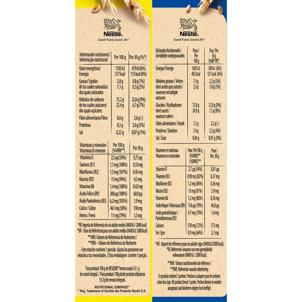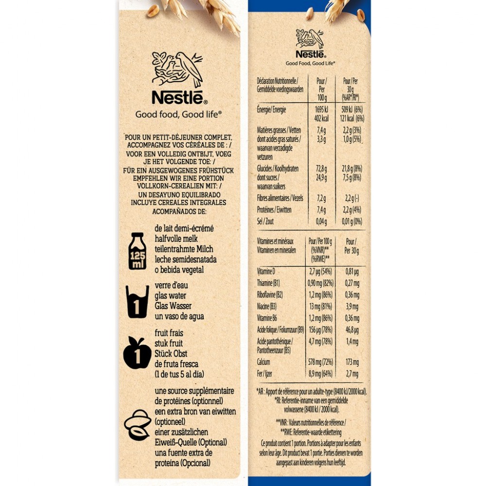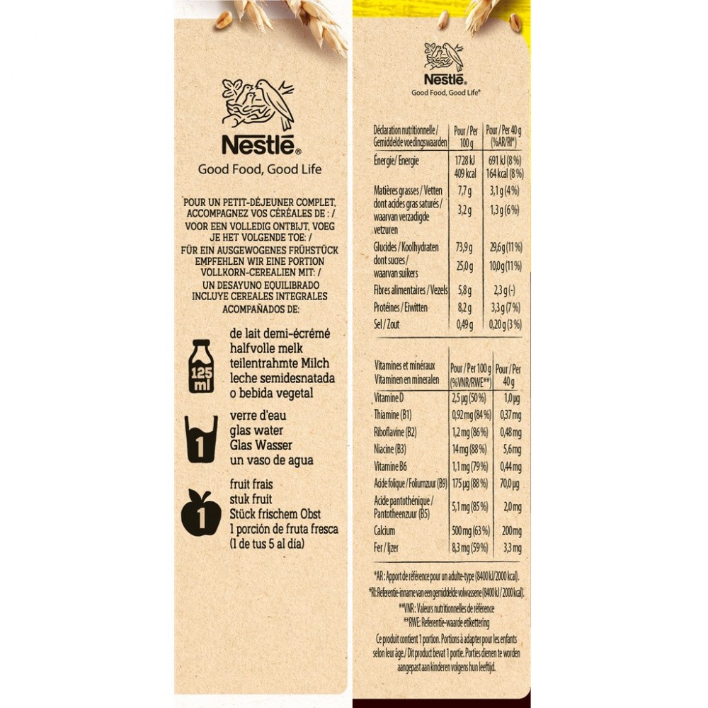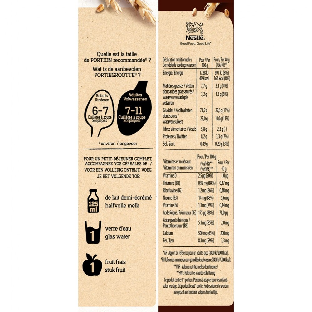 Ingrédients: Lion : BLE complet 41,3%, farine de BLE, sucre, sirop de glucose, huile de tournesol, chocolat 3,0% (cacao maigre en poudre*, sucre, pâte de cacao*), carbonate de calcium, sel, arômes naturels, émulsifiant : lécithines, sirop de sucre caramélisé, fer, vitamines B3, B5, D, B6, B1, B2, B9. Peut contenir du LAIT et FRUITS A COQUE. Chocapic : Farine de BLE complet 35,1%, chocolat en poudre 22,5% (sucre, cacao en poudre*), farine de BLE 17%, semoule de maïs, sirop de glucose, sucre, extrait de malt d'ORGE (ORGE, ORGE malté), huile de tournesol, carbonate de calcium, émulsifiant : lécithines ; sel, arômes naturels, fer, vitamines B3, B5, D, B6, B1, B2 et B9. Peut contenir du LAIT, FRUITS A COQUE. Crunch : BLE complet 35%, farine de riz, sucre, sirop de glucose, huile de tournesol, chocolat en poudre 5,6% (sucre, cacao en poudre*), semoule de maïs, sirop de sucre inverti, carbonate de calcium, cacao maigre en poudre*, émulsifiant : lécithines ; mélasse, sel, arôme naturel, fer, vitamines B3, B5, D, B6, B1, B2, B9. Peut contenir du LAIT et des FRUITS A COQUE. Cookie crisp : farine de BLE complet 35,3%, semoule de maïs, sucre, sirop de glucose, amidon de BLE, huile de tournesol, carbonate de calcium, cacao maigre en poudre* 1,7%, farine de BLE, sel, poudre à lever : carbonate de sodium ; arôme naturel, antioxydant : extrait riche en tocophérol ; fer, vitamines B3, B5, D, B9, B6, B2. Peut contenir du LAIT et des FRUITS A COQUE. Nesquik : farine de BLE complet 52,7%, sucre, semoule de maïs, sirop de glucose, cacao maigre en poudre* 5,5%, carbonate de calcium, huile de tournesol, sel, arômes naturels, fer, vitamines B3, B5, D, B6, B1, B2, B9. Peut contenir du LAIT et des FRUITS A COQUE.