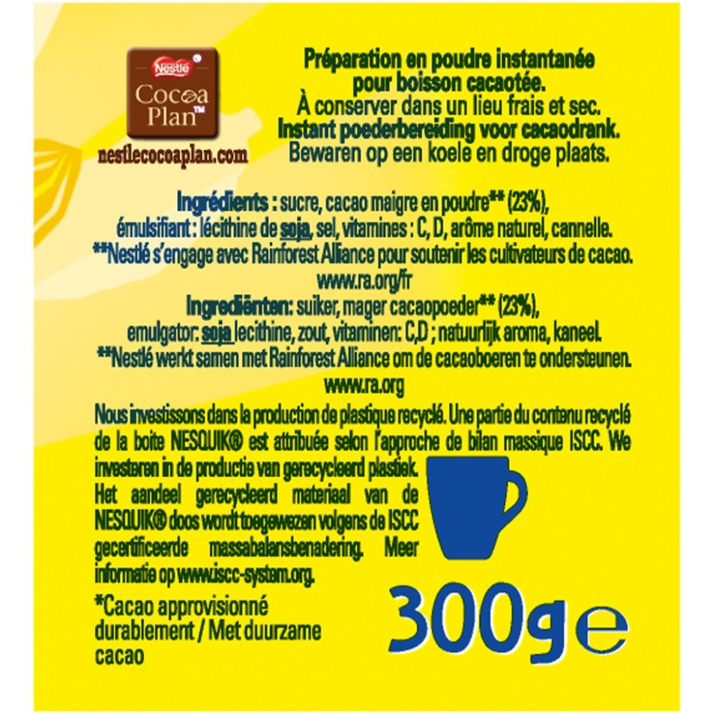 Ingrédients : Sucre, cacao maigre en poudre (23%)*, émulsifiant : lécithine de SOJA, sel, vitamines (C, D), arôme naturel, cannelle. *Bilan massique certifié Rainforest Alliance www.ra.org/fr.