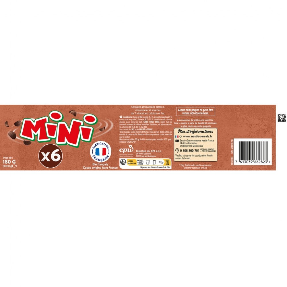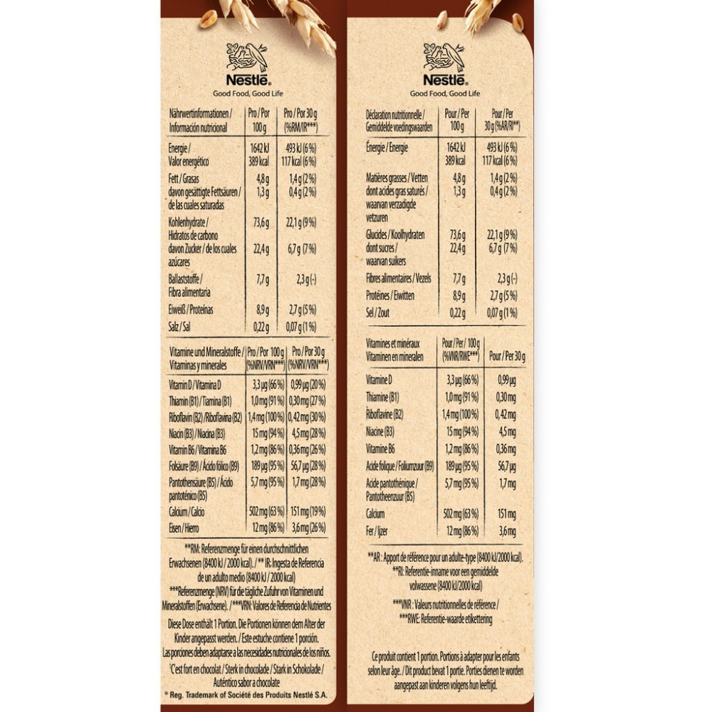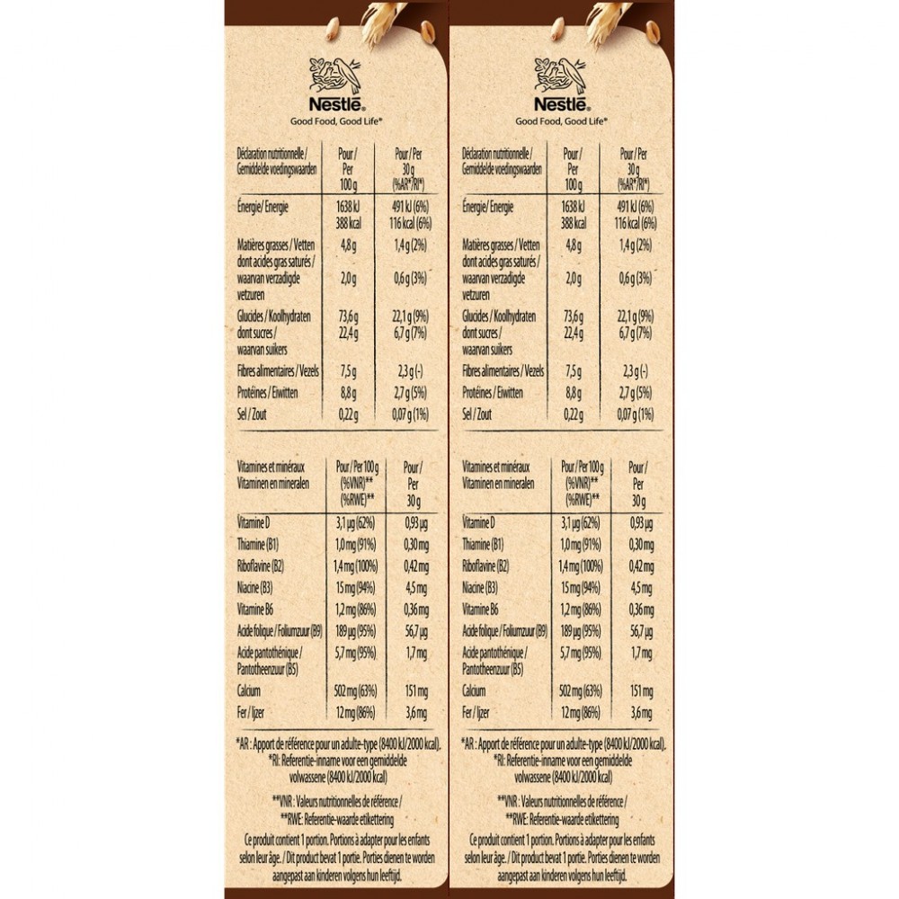 Ingrédients : farine de BLÉ complet 35,1 %, chocolat en poudre 22,5 % (sucre, cacao en poudre*), farine de BLÉ 17,0 %, semoule de maïs, sirop de glucose, sucre, extrait de malt d'ORGE (ORGE, ORGE malté), huile de tournesol, carbonate de calcium, émulsifiant : lécithines ; sel, arômes naturels, fer, vitamines B3, B5, D, B6, B1, B2 et B9. Peut contenir du LAIT et des FRUITS À COQUE. *Bilan massique certifié Rainforest Alliance. www.ra.org/fr. Nestlé achète une quantité de cacao certifié Rainforest Alliance équivalente à celle nécessaire pour ce produit.
