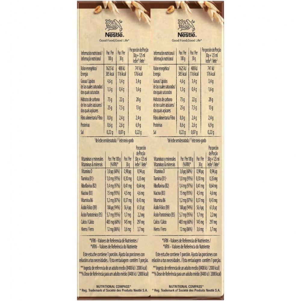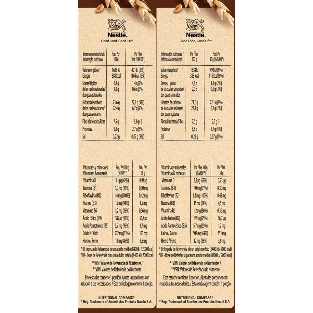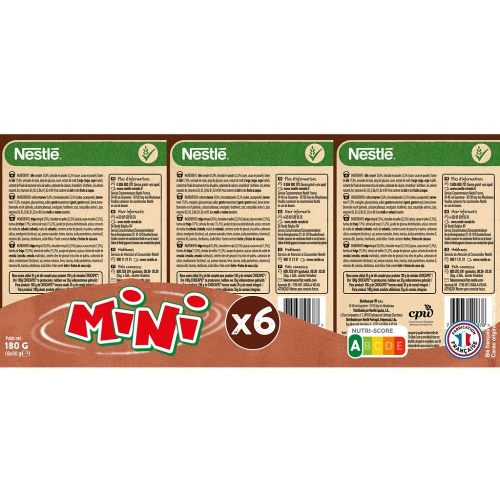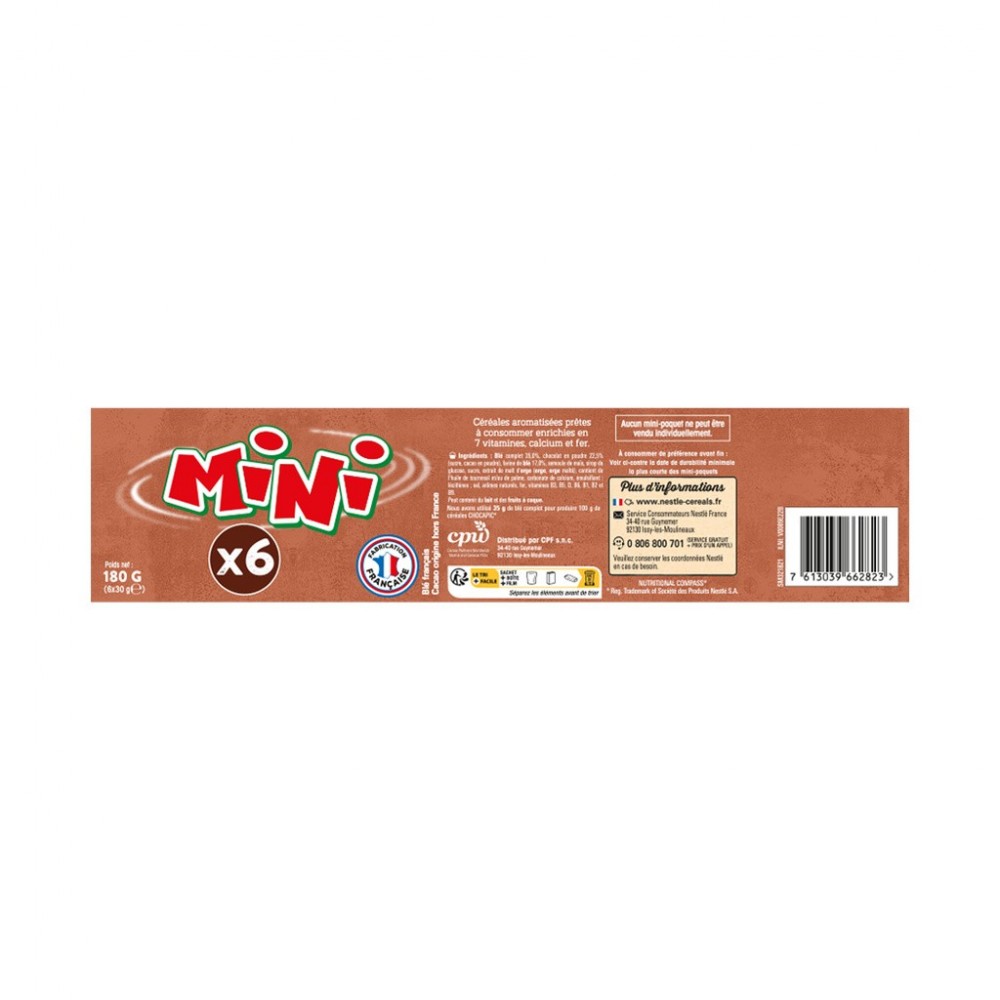 Ingrédients : farine de BLÉ complet 35,1 %, chocolat en poudre 22,5 % (sucre, cacao en poudre*), farine de BLÉ 17,0 %, semoule de maïs, sirop de glucose, sucre, extrait de malt d'ORGE (ORGE, ORGE malté), huile de tournesol, carbonate de calcium, émulsifiant : lécithines ; sel, arômes naturels, fer, vitamines B3, B5, D, B6, B1, B2 et B9. Peut contenir du LAIT et des FRUITS À COQUE. *Bilan massique certifié Rainforest Alliance. www.ra.org/fr. Nestlé achète une quantité de cacao certifié Rainforest Alliance équivalente à celle nécessaire pour ce produit.