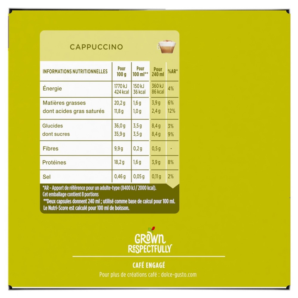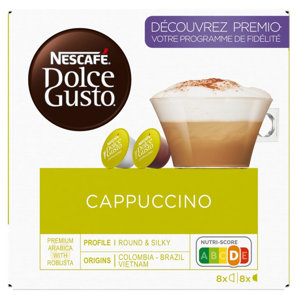 Découvrez le Cappuccino NESCAFE Dolce Gusto, une véritable icône à l'italienne. Les arômes riches et puissants d'un espresso intense rencontrent la douceur et la texture crémeuse de la mousse de lait entier. Nos créateurs de café ont revisité spécialement pour vous cette boisson emblématique. L'assemblage des Arabicas de Colombie et du Brésil, soigneusement équilibré avec un soupçon de Robusta d'Asie, révèle tout son caractère en s'alliant harmonieusement à l'onctuosité du lait. Dégustez à la cuillère la mousse onctueuse, savourez son corps velouté, et découvrez le plaisir intense de cette boisson à base d'espresso. Grâce à nos capsules hermétiquement scellées qui préservent la fraîcheur du café, vous apprécierez une richesse aromatique incomparable à chaque tasse.