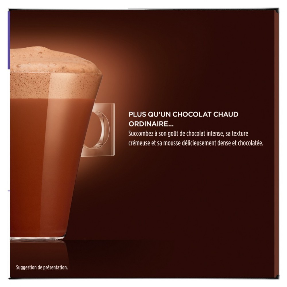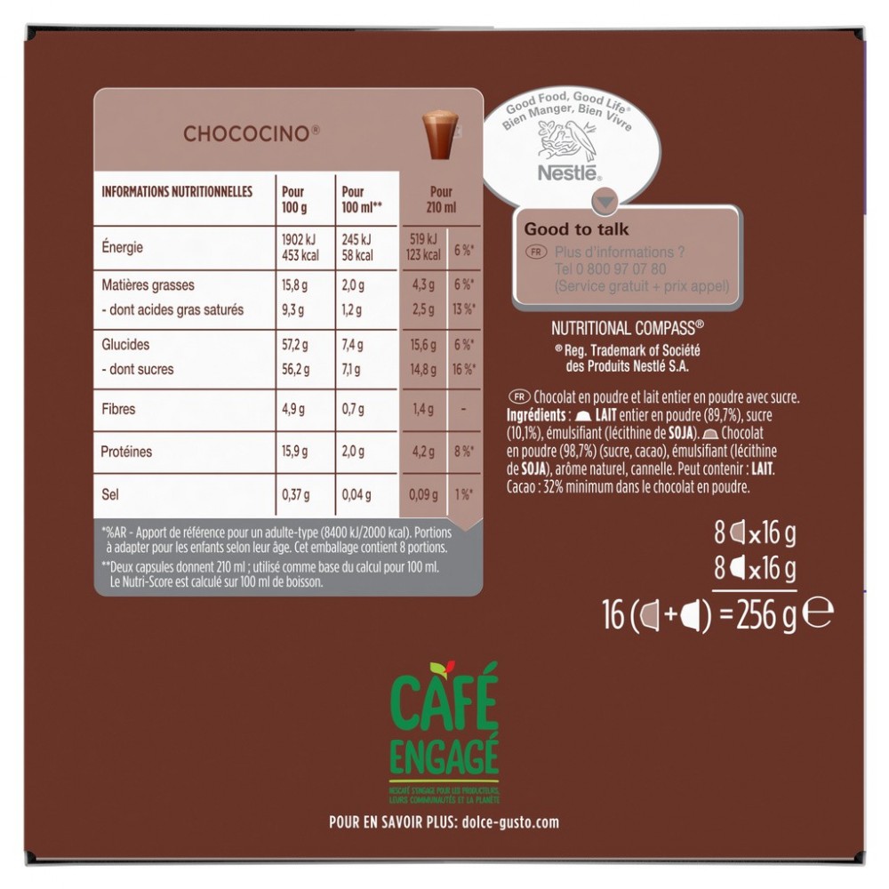 Découvrez le délicieux CHOCOCINO NESCAFE Dolce Gusto. Ce n'est pas un chocolat chaud ordinaire. CHOCOCINO se caractérise par un goût de chocolat intense avec des notes vanillées, agrémenté d'une mousse délicieusement dense et chocolatée. CHOCOCINO NESCAFE Dolce Gusto est présenté en deux capsules : une capsule de délicieux chocolat et une capsule de lait entier. Grâce à nos capsules hermétiquement scellées qui préservent la fraîcheur de la recette, vous apprécierez une richesse aromatique incomparable à chaque tasse.