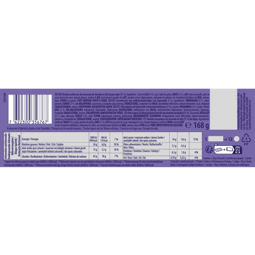 Biscuits avec des morceaux de chocolat au lait du pays alpin (31 %).