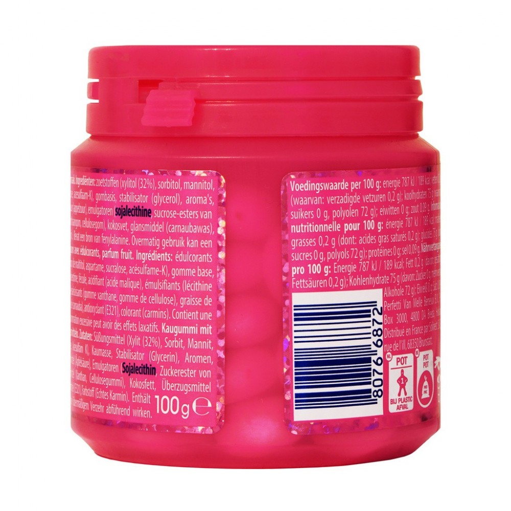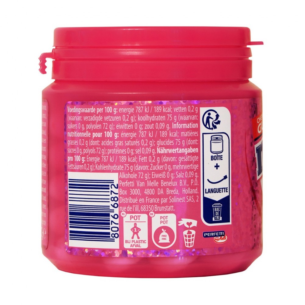 Edulcorants (xylitol, sorbitol, mannitol, sirop de malitol, aspartame, sucralose, acésulfame-K), gomme base, stabilisant, (glycérol), maltodextrine, arômes, fécule, acidifiant (acide malique), émulsifiants (lécithine de SOJA, sucroesters d'acides gras), extrait de thé vert (0,1%), épaississants (gomme xanthane, gomme de cellulose), graisse de noix de coco, agent d'enrobage (cire de carnauba), antioxydant (E321), colorant (carmins).