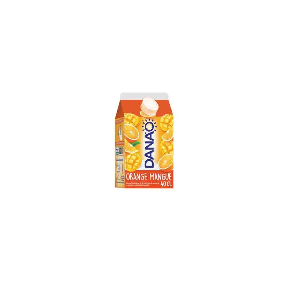 Jus de fruit à base de concentrés 70.6%(pomme 49.6%, orange 13.8%, mangue 7.2%), LAIT écrémé 16%, eau, stabilisant : pectine de fruit, acidifiant : acide citrique, Vitamines C et E, arômes naturels, colorant : carotènes.