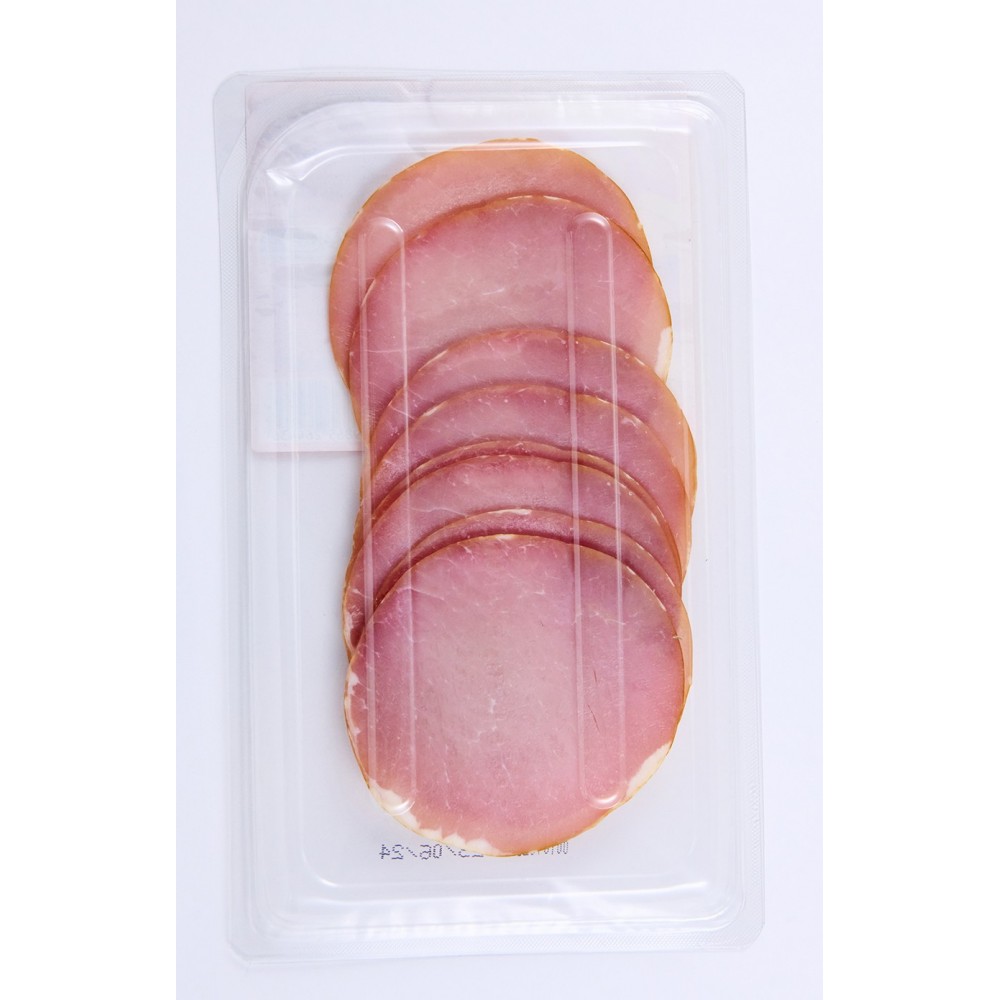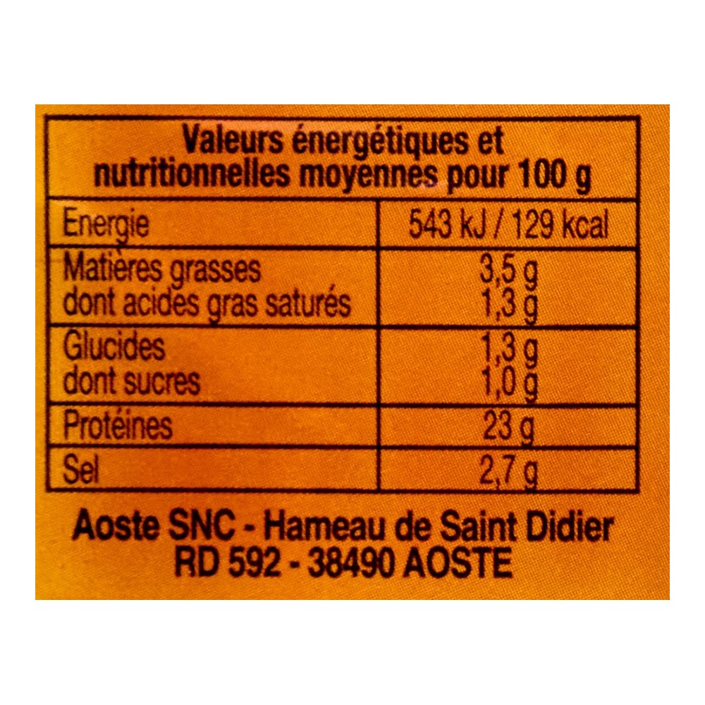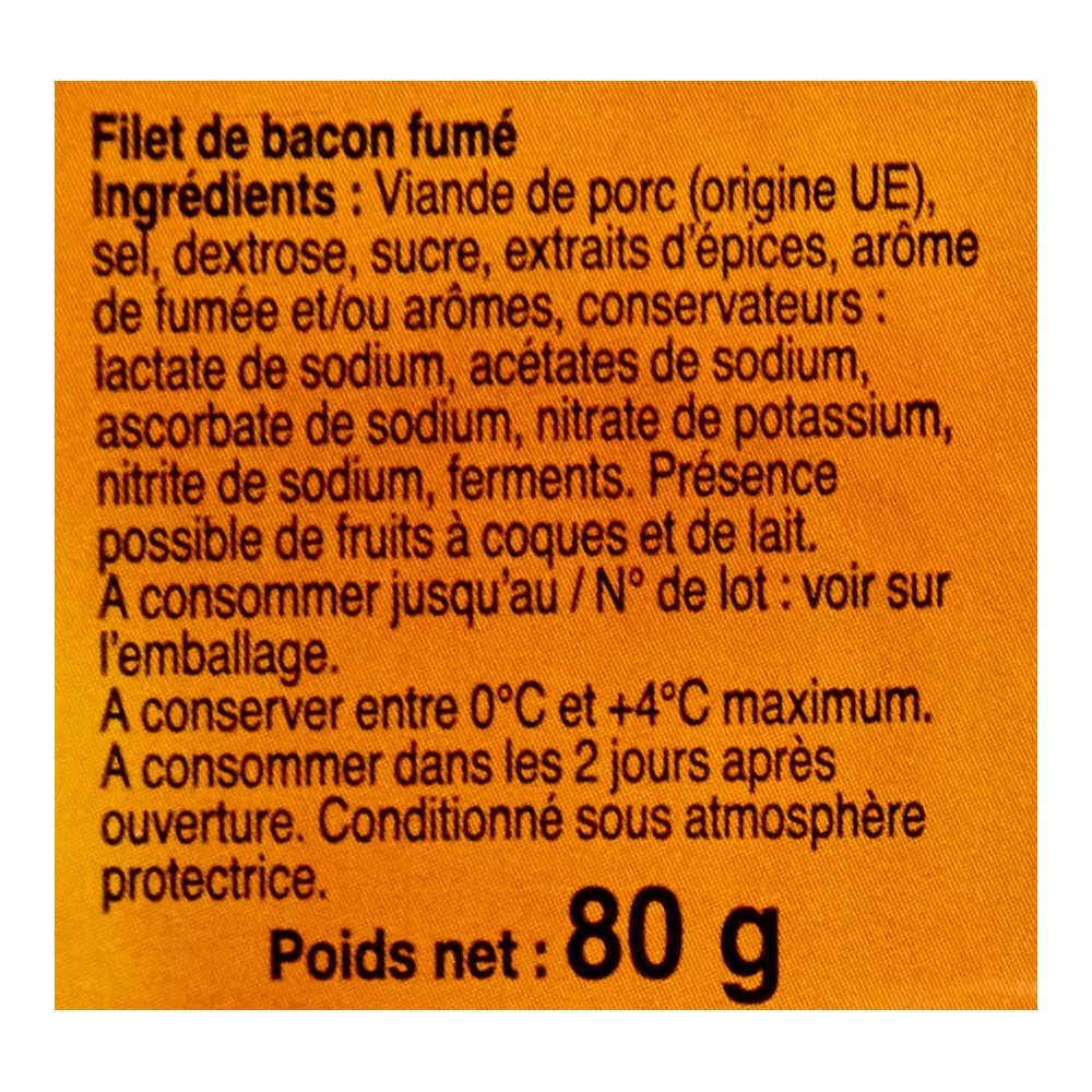 Viande de porc, sel, dextrose, sucre, extraits d'épices, arôme de fumée et/ou arômes, conservateur : lactate de sodium, acétates de sodium, ascorbate de sodium, nitrate de potassium, nitrite de sodium, ferments