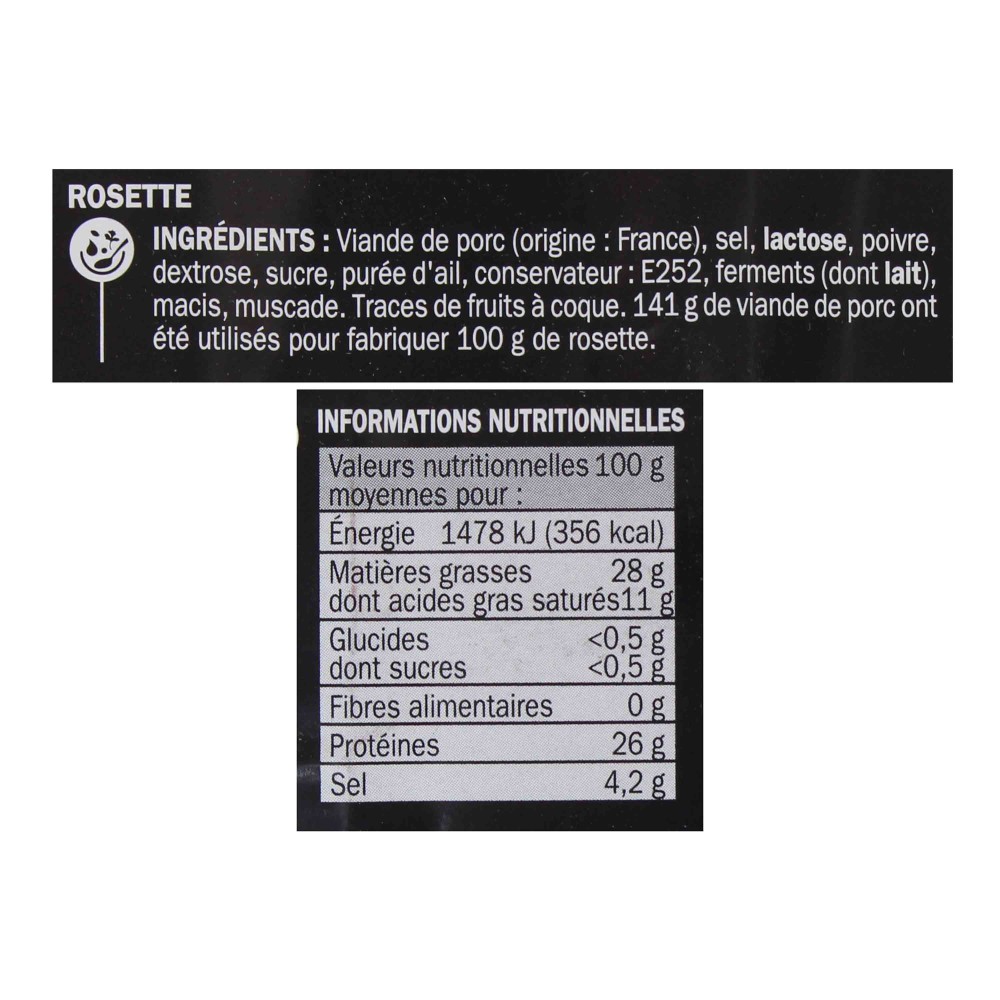 Viande de porc (origine : France), sel, lactose, poivre, dextrose, sucre, purée d'ail, conservateur : E252, ferments (dont lait), macis, muscade.