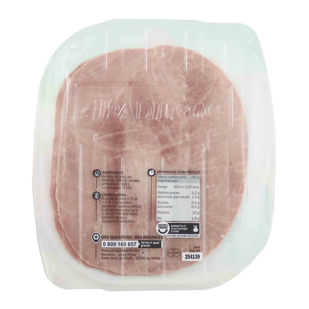 Jambon de porc, sel, dextrose, arômes naturels, antioxydant : E301, conservateur : E250.
