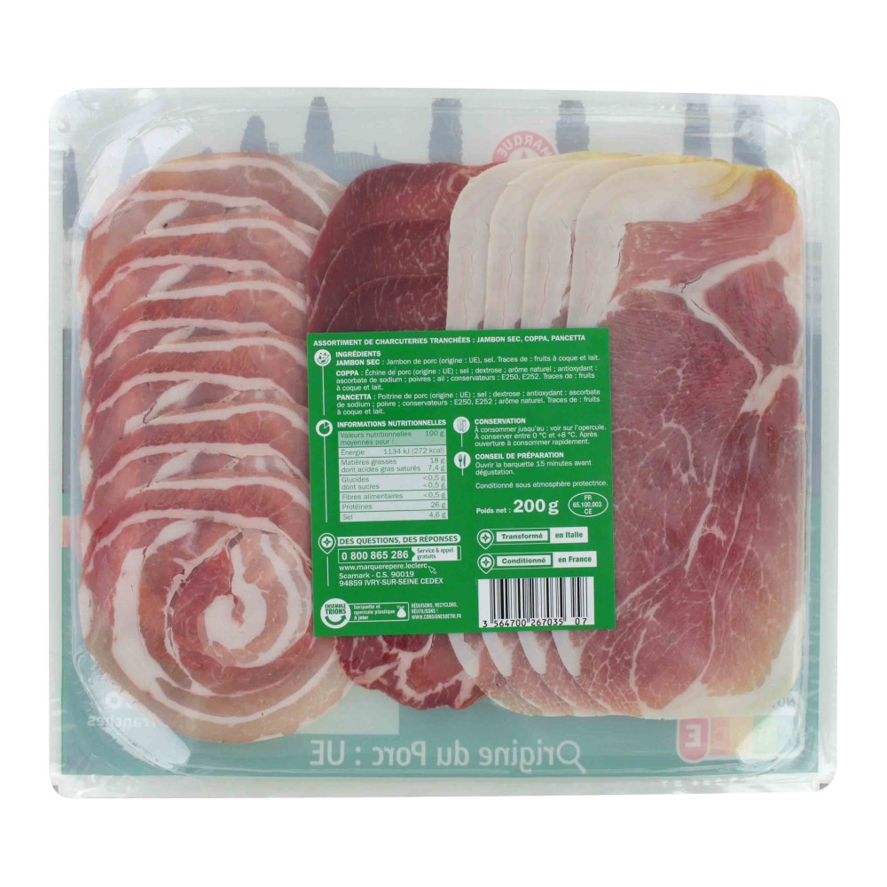 Assortiment de charcuteries prétranchées : jambon cru, coppa, pancetta