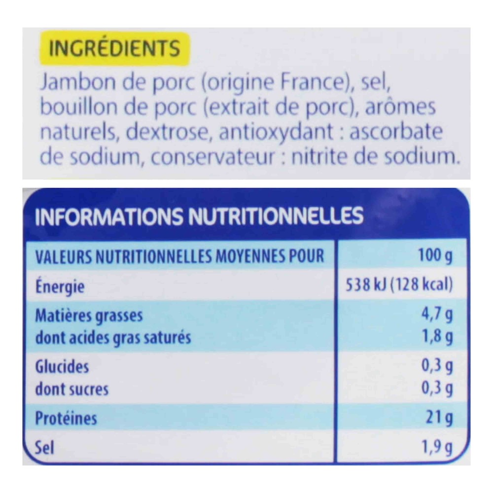 Jambon de porc (origine France), sel, bouillon de porc (extrait de porc), arômes naturels, dextrose, gélatine de porc, bouillon (jus de légumes (oignon, poireau, ail, carotte)), épices et plantes aromatiques, antioxydant: ascorbate de sodium, conservateur: nitrite de sodium.