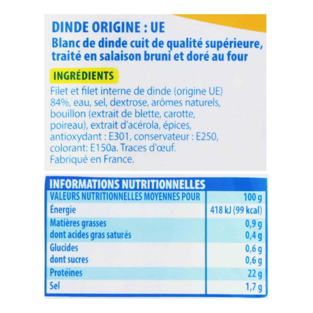 Filet et filet interne de dinde (origine UE) 84%, eau, sel, dextrose, arômes naturels, bouillon (extrait de blette, carotte, poireau), extrait d'acérola, épices, antioxydant: E301, conservateur: E250, colorant: E150a. Traces d'œuf.