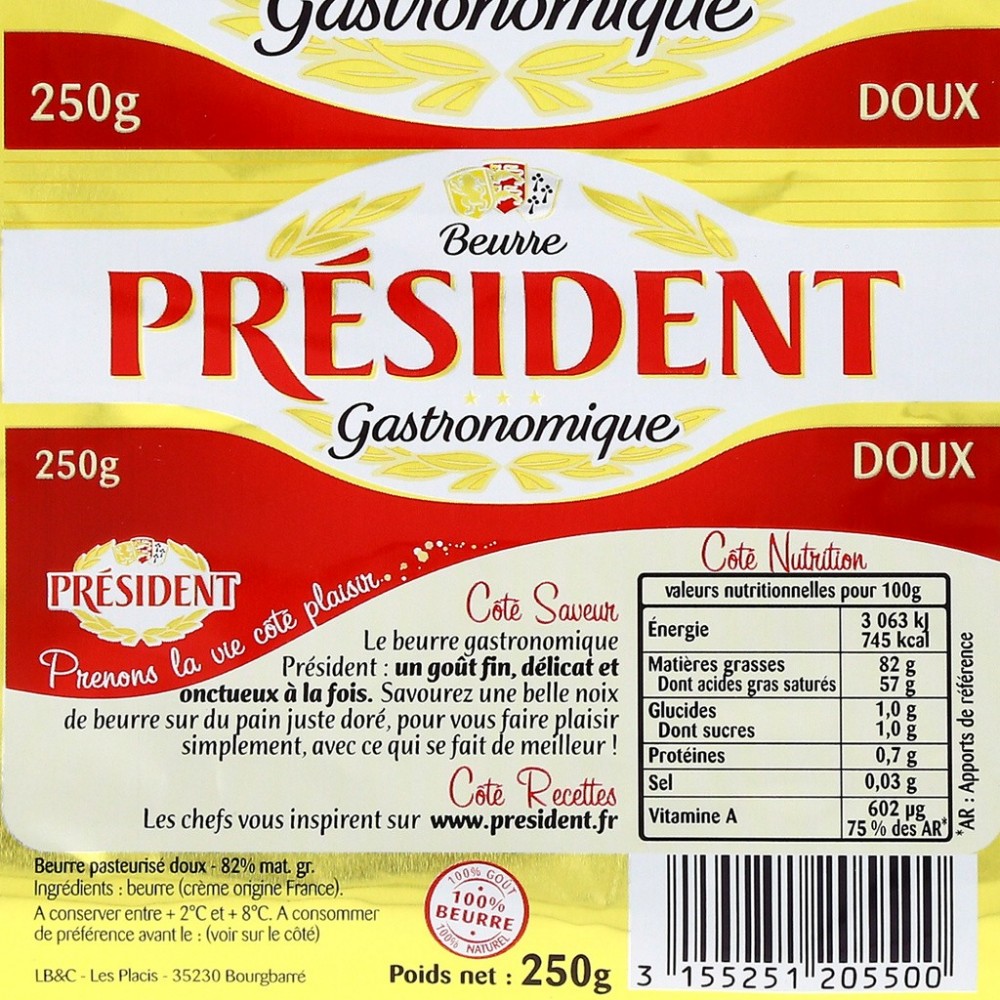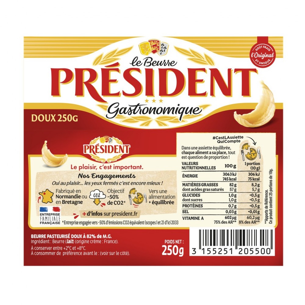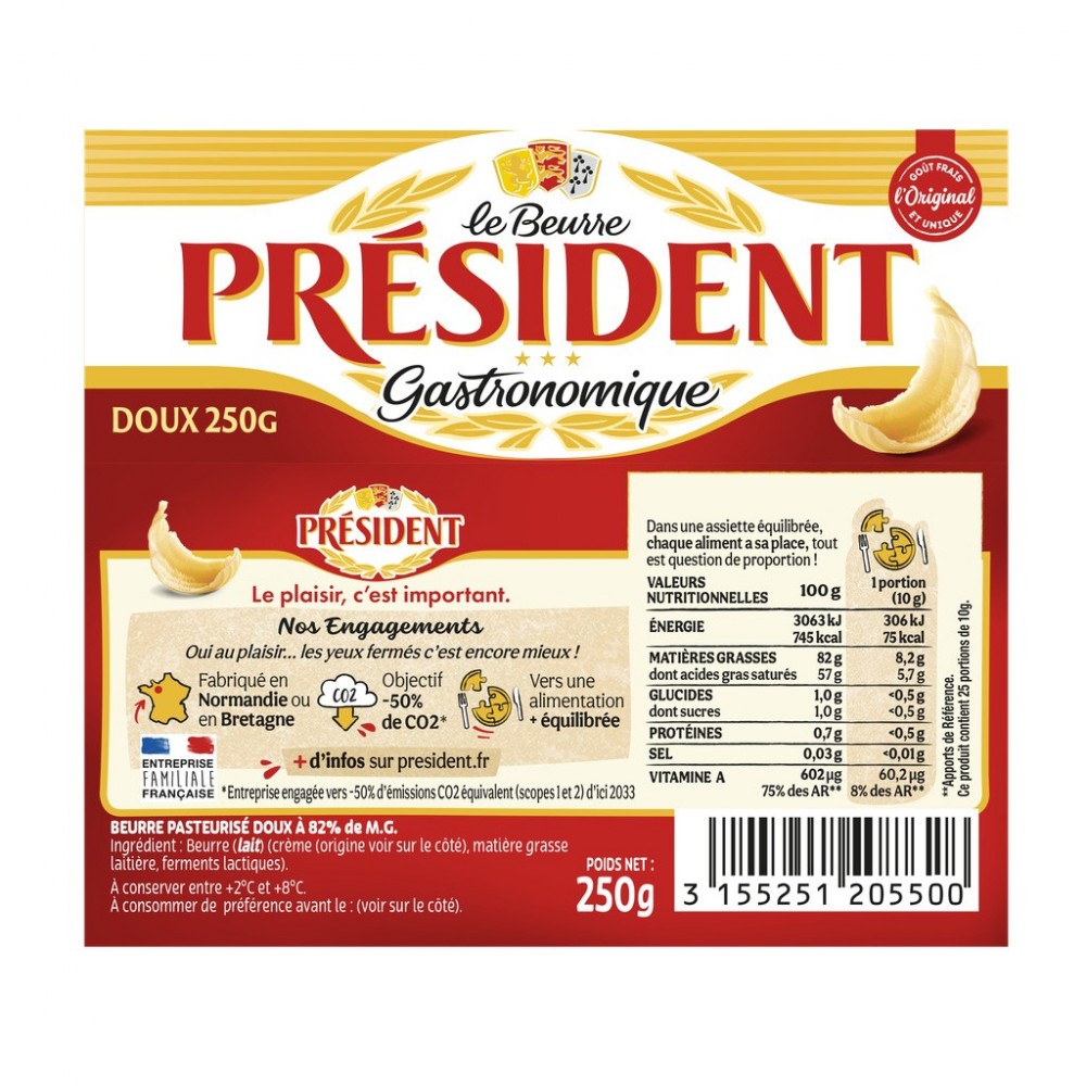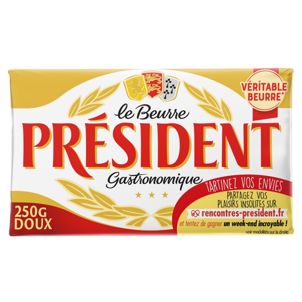 Fabriqué en Bretagne ou en Normandie, le beurre gastronomique Président, au goût frais et unique s'utilise en tartine ou en cuisine pour révéler toutes les saveurs de vos plats.