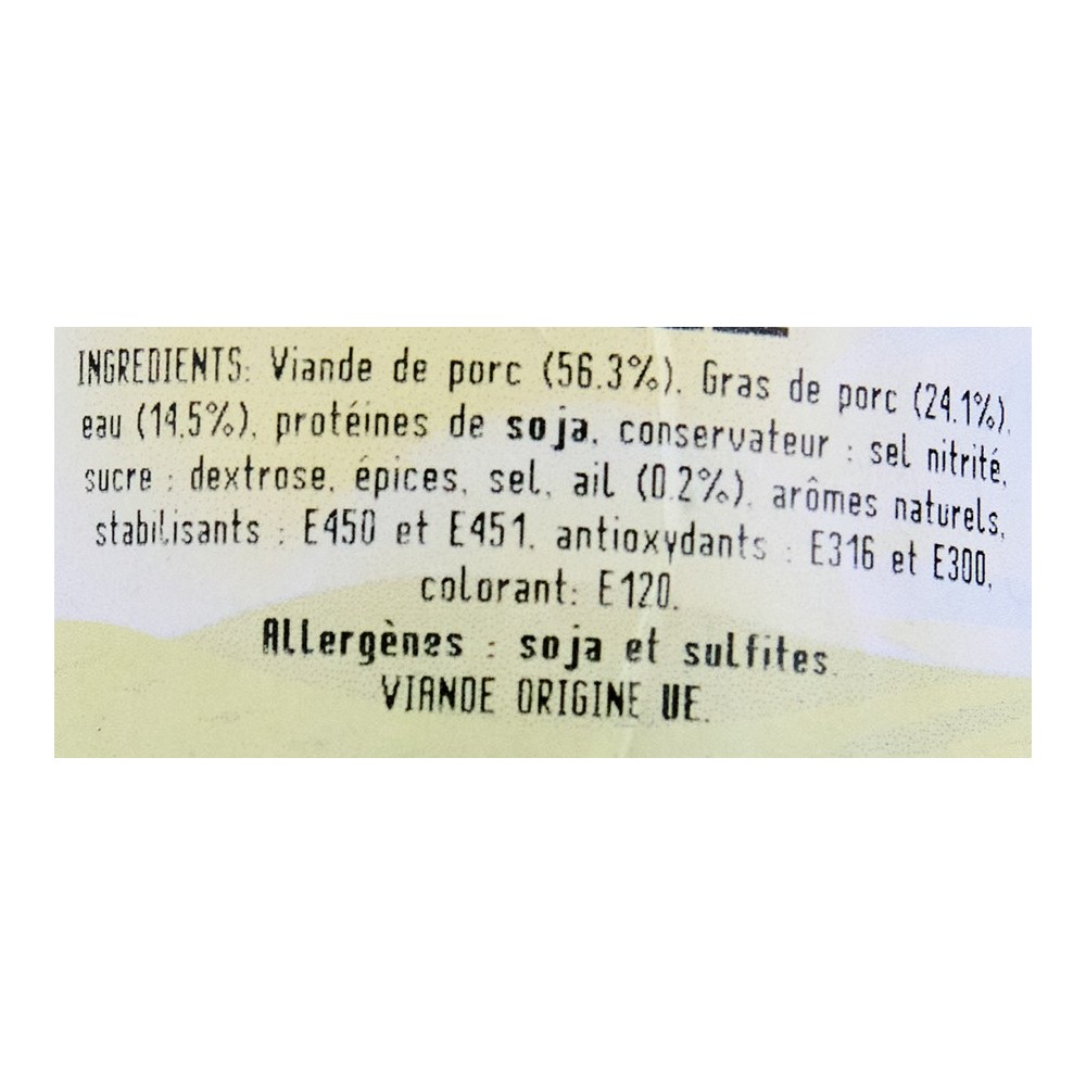 viande de porc (56,3%), gras de porc, eau (14,5%), protéine de soja, conservateur, sel, sucre, dextrose, épices, sel, ail (0,2%), arômes naturels, stabilisants : E450 et E451, antioxydants : E316 et E300, colorant : E120
