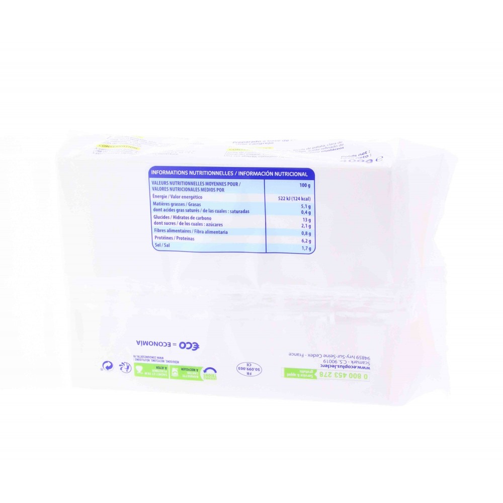 Ingrédients: eau, chair de poisson 30 %, fécule de pomme de terre, blanc d'œuf déshydraté, amidon de blé, huile de colza, sucre, sel, arômes naturels (dont crustacés, blé), colorant: E160c.