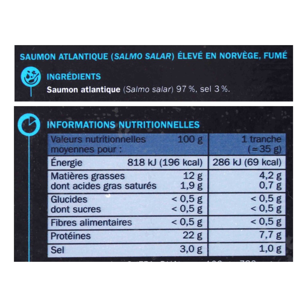 Saumon atlantique (Salmo salar) 97 %, sel 3 %.