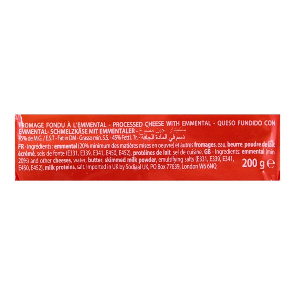 Emmental 20%, autres fromages, beurre, eau, poudre de lait écrémé, sels de fonte (E331, E339, E341, E450, E452), protéines de lait, sel de cuisine
