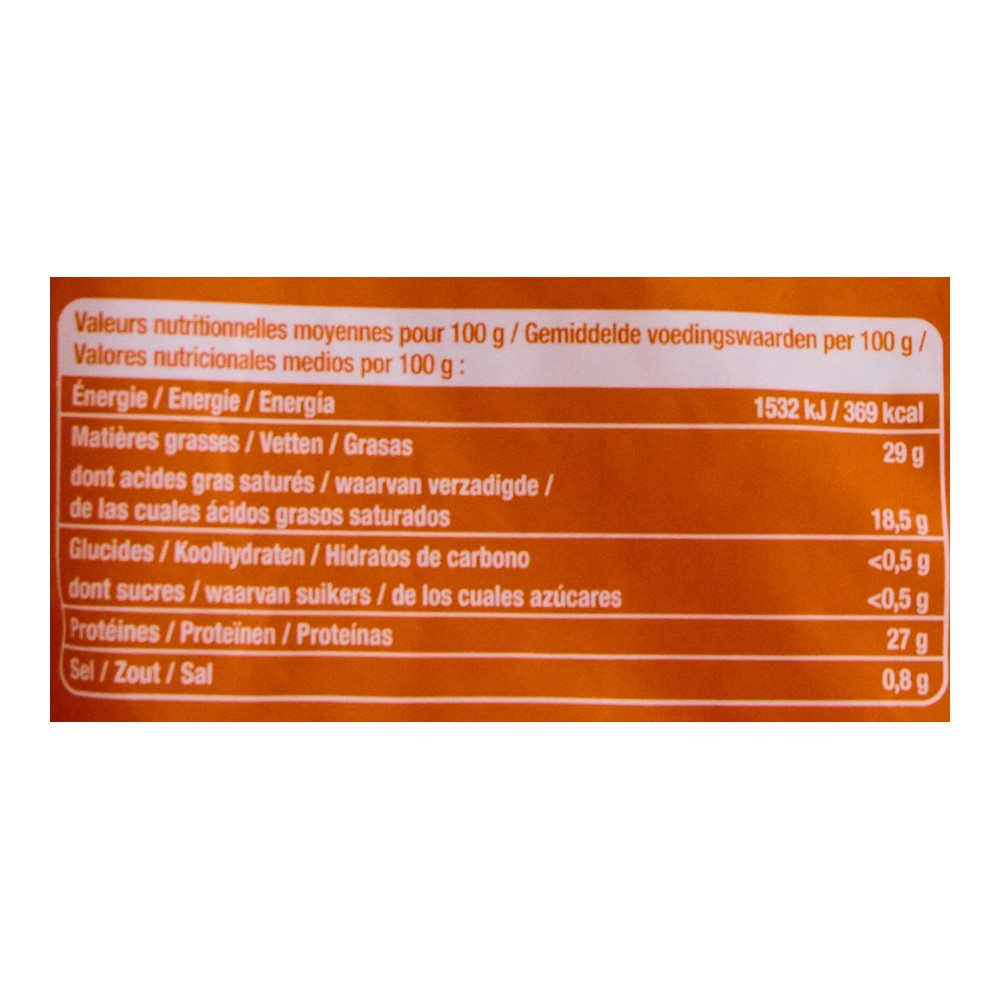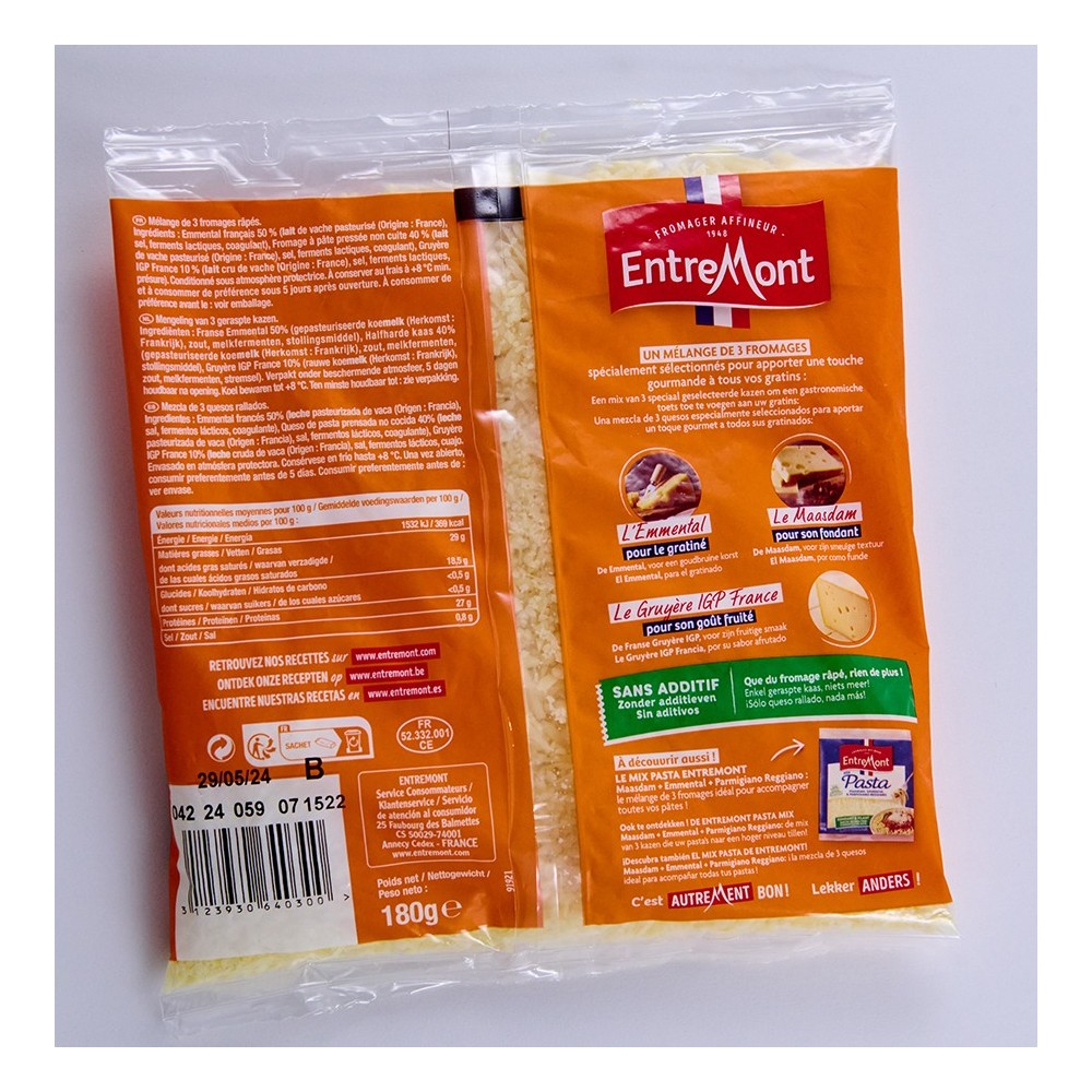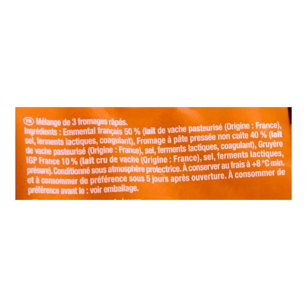 Emmental français 50% (lait de vache pasteurisé (origine : France), sel, ferments lactiques, coagulant), fromage à pate pressée non cuite 40% (lait de vache pasteurisé (origine : France), sel, ferments lactiques, coagulant), gruyère IGP France 10% (lait cru de vache (origine france), sel, ferments lactiques, présure)