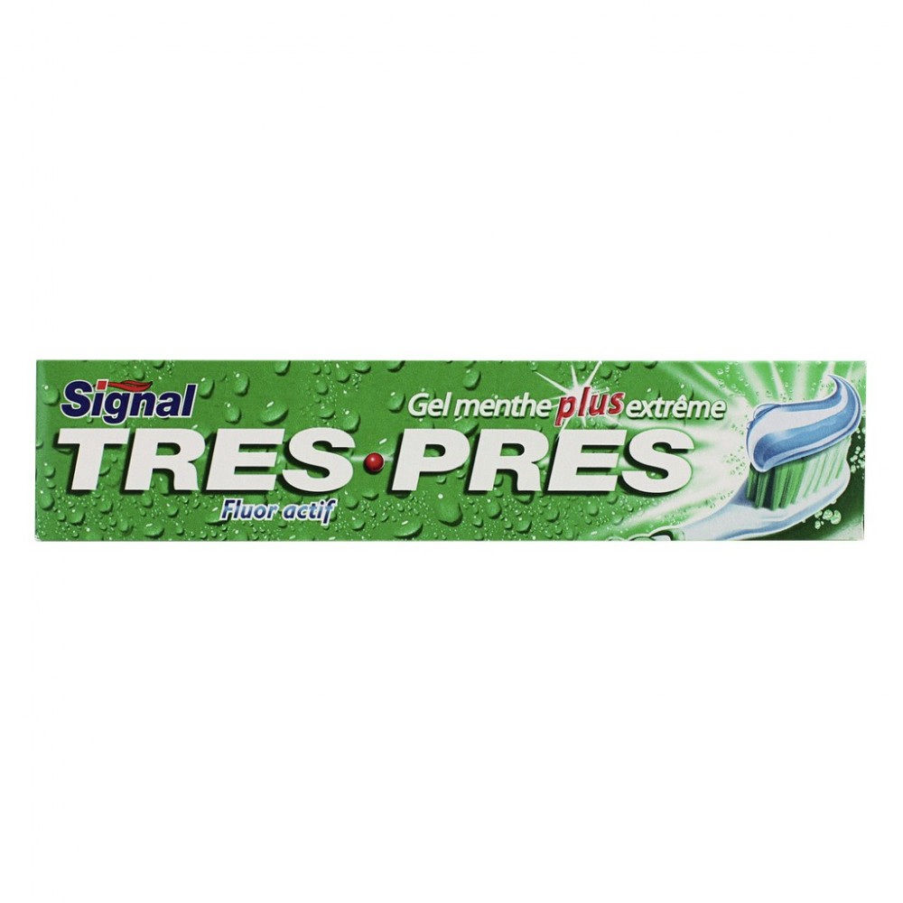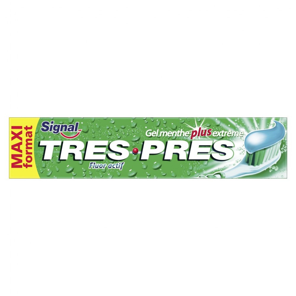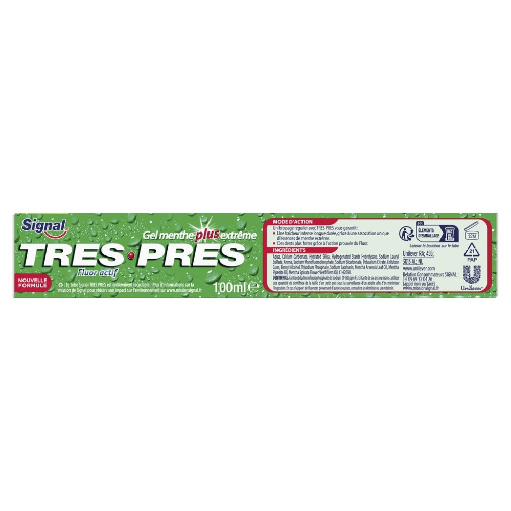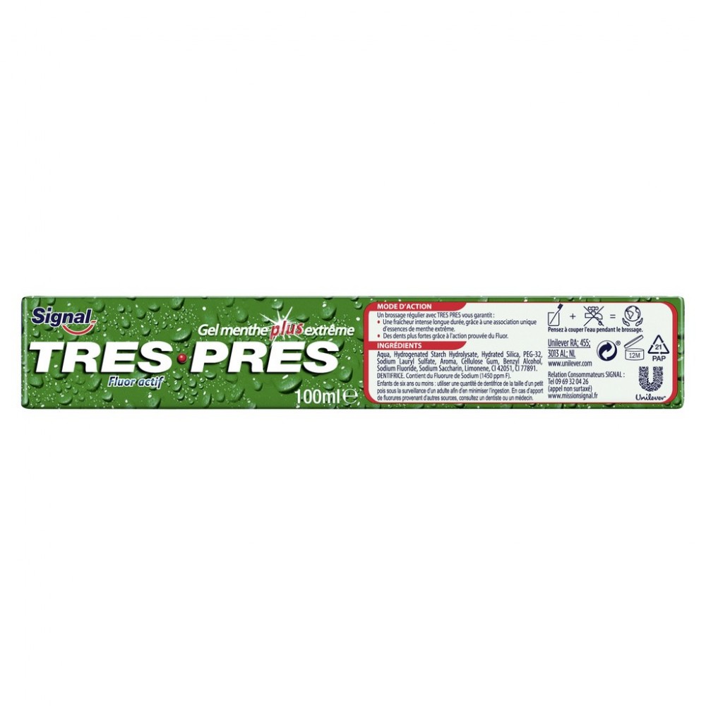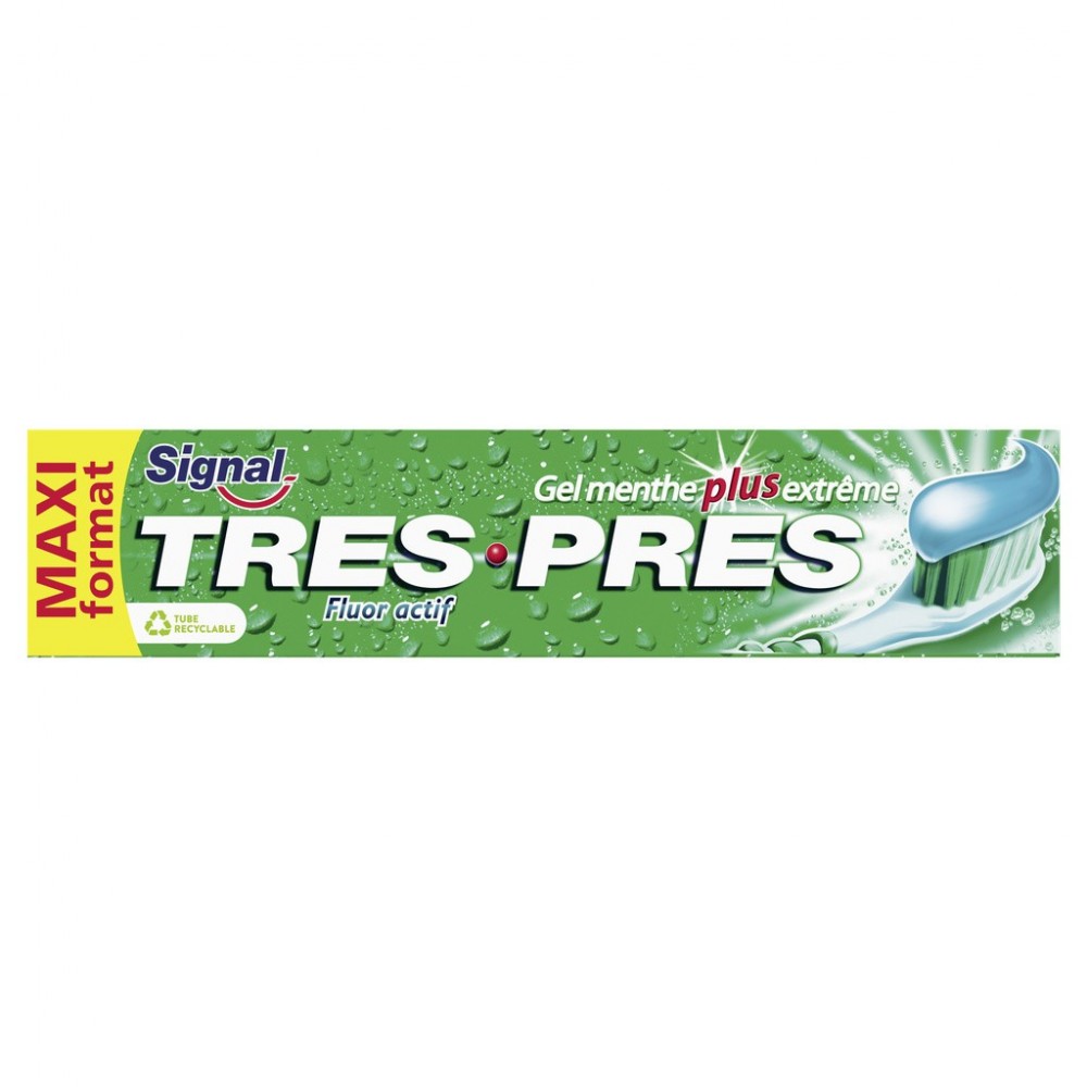 Le dentifrice Signal Très Près garantit une fraîcheur intense longue durée. Sa formule contient une association unique d'essences de menthe extrême pour une haleine durablement purifiée. Elle est également enrichie en fluor pour des dents encore plus fortes. Nos conseils Signal pour une bonne hygiène bucco-dentaire : brossez-vous les dents après chaque repas, changez de brosse à dents Signal tous les 2 à 3 mois et consultez votre dentiste au moins 2 fois par an. Pensez aussi à couper l'eau pendant le brossage. Découvrez aussi d'autres dentifrices Signal comme le dentifrice Soin Fraîcheur et Crystal Gel ou le dentifrice blancheur White Now Ice Cool. Chez Signal, nous pensons que votre sourire est l'expression de votre personnalité et de votre confiance en vous. Notre mission : améliorer la santé bucco-dentaire de tous, pour que chacun d'entre nous libère le pouvoir de son sourire. Signal accompagne les Français depuis 1961 pour leur transmettre les bons gestes, dès le plus jeune âge et démontrer l'importance d'un brossage deux fois par jour, matin et soir. Attentifs à la protection de la planète, nous prenons des mesures pour limiter l'impact environnemental de nos produits. En partenariat avec TerraCycle®, nous avons lancé un programme de recyclage gratuit, pour donner une seconde vie à vos brosses à dents et vos tubes de dentifrice. Avec Signal, chaque sourire compte !