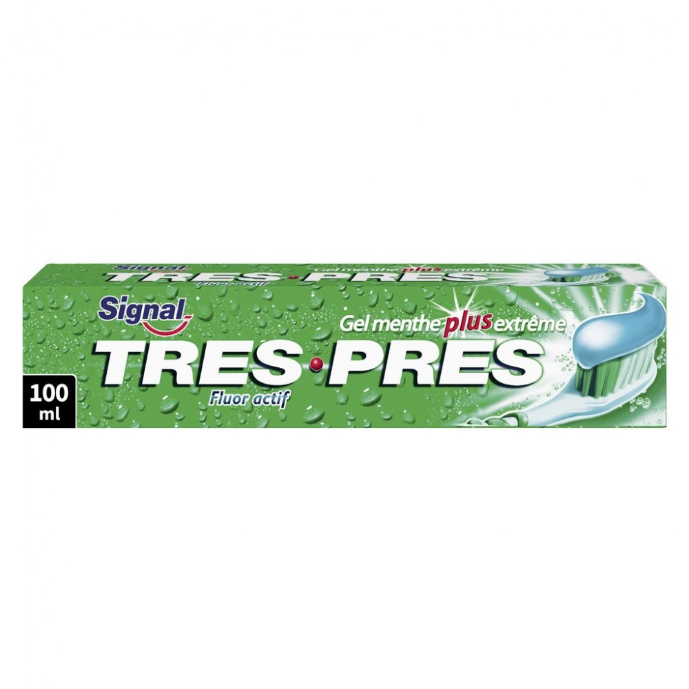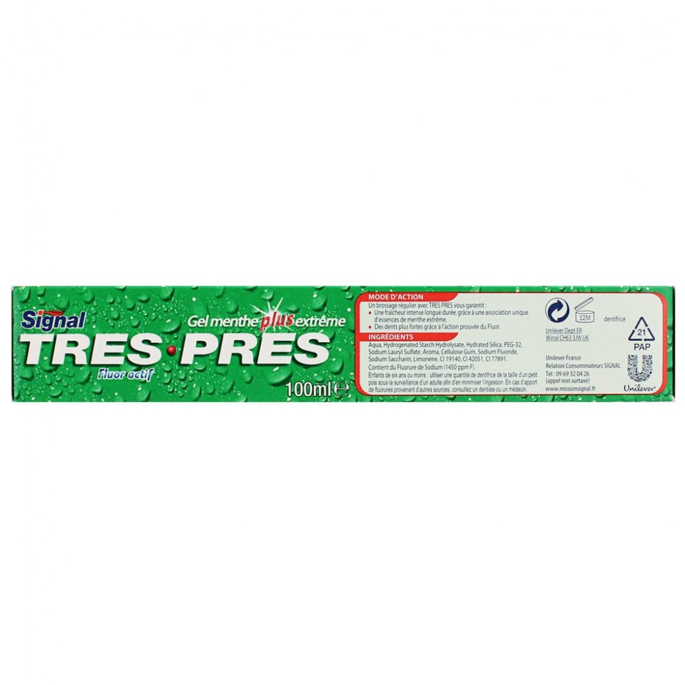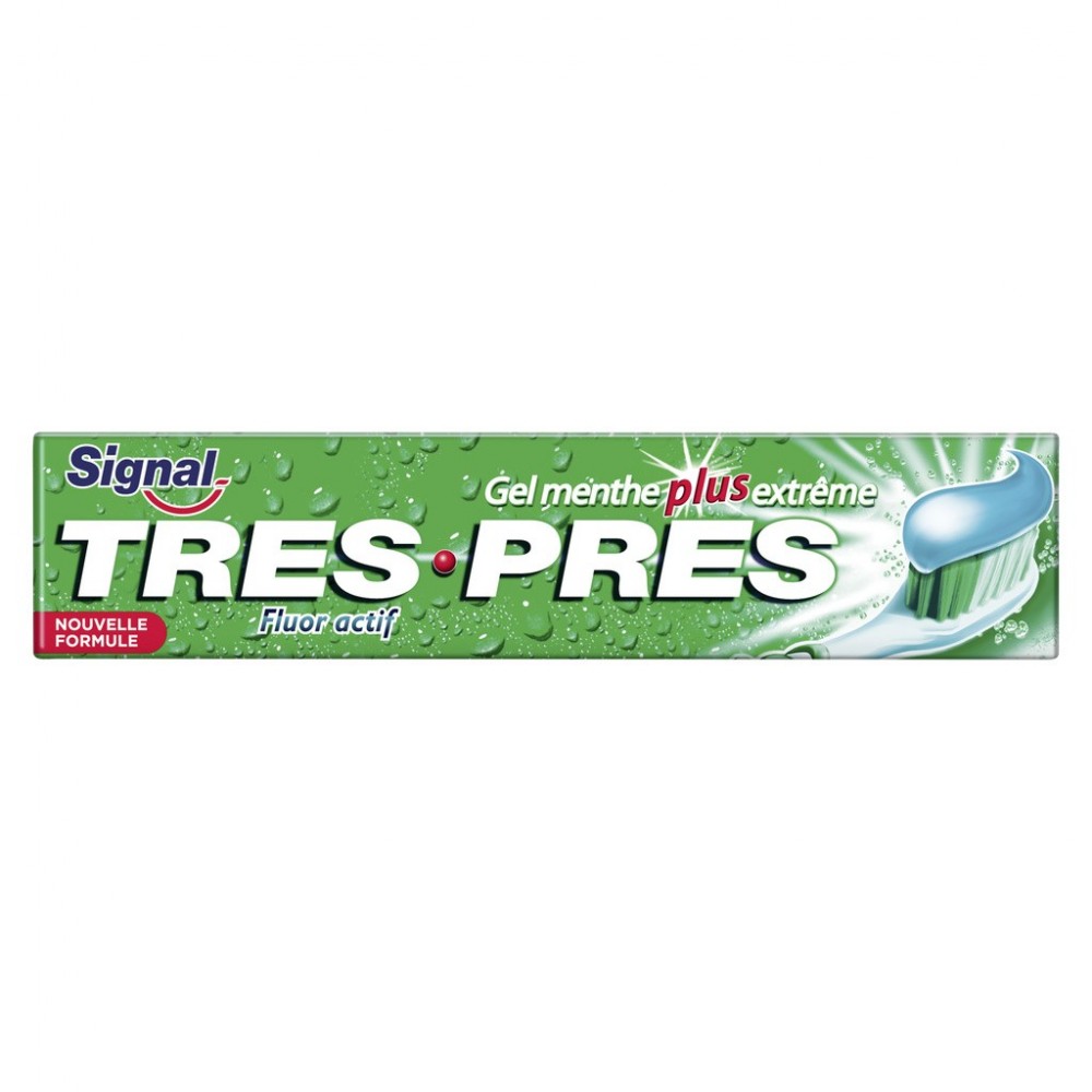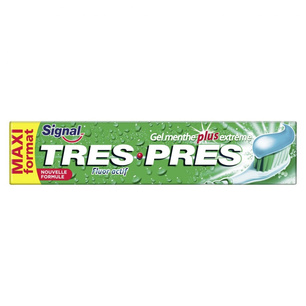 Le dentifrice Signal Très Près garantit une fraîcheur intense longue durée. Sa formule contient une association unique d'essences de menthe extrême pour une haleine durablement purifiée. Elle est également enrichie en fluor pour des dents encore plus fortes. Nos conseils Signal pour une bonne hygiène bucco-dentaire : brossez-vous les dents après chaque repas, changez de brosse à dents Signal tous les 2 à 3 mois et consultez votre dentiste au moins 2 fois par an. Pensez aussi à couper l'eau pendant le brossage. Découvrez aussi d'autres dentifrices Signal comme le dentifrice Soin Fraîcheur et Crystal Gel ou le dentifrice blancheur White Now Ice Cool. Chez Signal, nous pensons que votre sourire est l'expression de votre personnalité et de votre confiance en vous. Notre mission : améliorer la santé bucco-dentaire de tous, pour que chacun d'entre nous libère le pouvoir de son sourire. Signal accompagne les Français depuis 1961 pour leur transmettre les bons gestes, dès le plus jeune âge et démontrer l'importance d'un brossage deux fois par jour, matin et soir. Attentifs à la protection de la planète, nous prenons des mesures pour limiter l'impact environnemental de nos produits. En partenariat avec TerraCycle®, nous avons lancé un programme de recyclage gratuit, pour donner une seconde vie à vos brosses à dents et vos tubes de dentifrice. Avec Signal, chaque sourire compte !