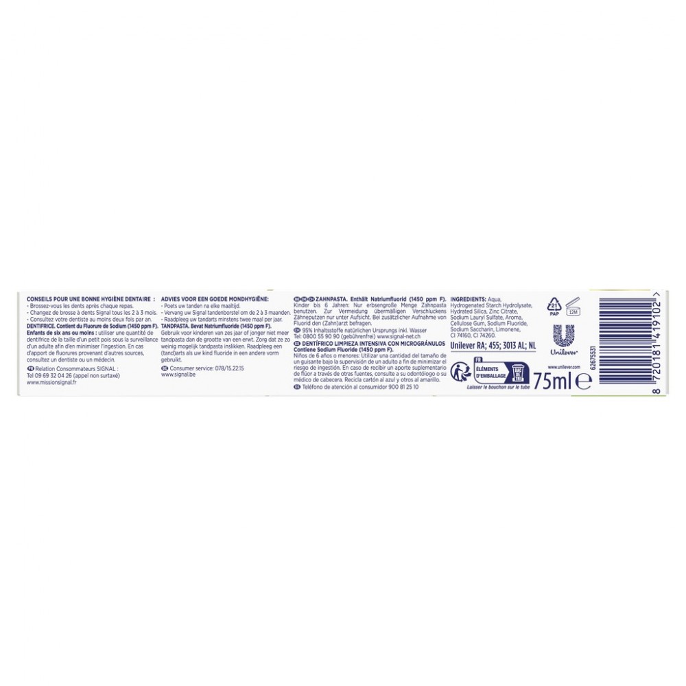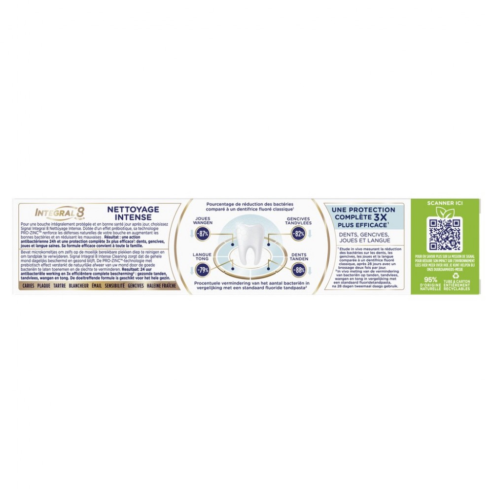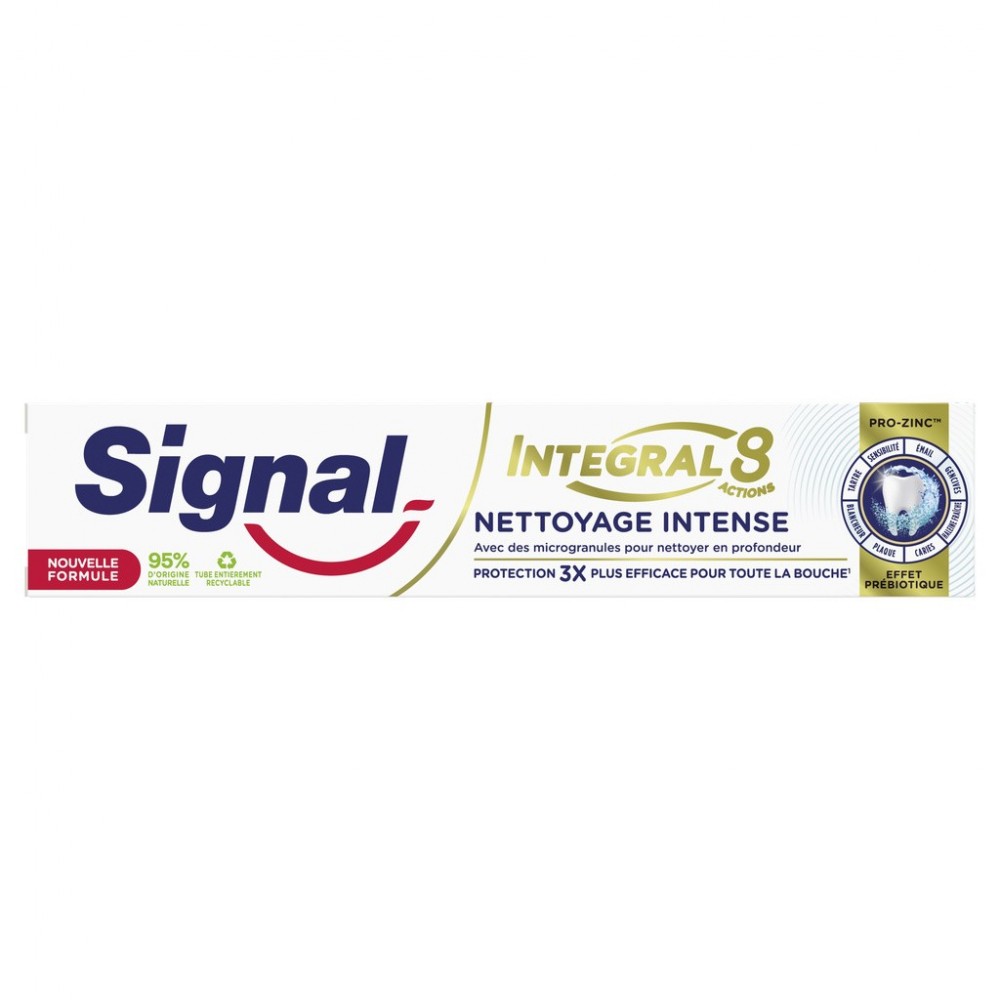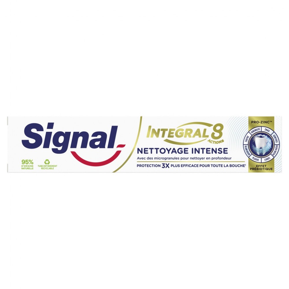 Pour une bouche intégralement protégée et en bonne santé jour après jour, choisissez Signal Integral 8 Nettoyage Intense. Dotée d'un effet prébiotique, sa technologie PRO-ZINC™ renforce les défenses naturelles de votre bouche en augmentant les bonnes bactéries et en réduisant les mauvaises. Sa nouvelle formule contient des microgranules pour nettoyer en profondeur même dans les zones difficiles d'accès et éliminer la plaque dentaire. Elle permet également une action antibactérienne de 24 h et une protection complète 3 x plus efficace¹ : dents, gencives, joues et langue saines. Composée de 96 % d'ingrédients d'origine naturelle, elle convient à toute la famille. Ce dentifrice Integral 8 offre 8 actions : protection caries, protection gencives, émail renforcé, action blancheur, haleine fraîche, anti-plaque, anti-tartre et sensibilité. De plus, son tube est entièrement recyclable. Pour une bonne hygiène bucco-dentaire de toute la famille, suivez ces étapes simples : (1) le matin, brossez-vous les dents avec le dentifrice et la brosse à dents Signal, et rincez-vous la bouche avec le bain de bouche Signal. (2) Pendant la journée, rafraichissez votre haleine avec le bain de bouche Signal. (3) Le soir, brossez-vous les dents avec la brosse à dents et le dentifrice Signal et rincez-vous avec le bain de bouche Signal. Pensez à changer votre brosse à dents tous les 3 mois et vous rendre régulièrement chez le dentiste. ¹Étude in vivo sur la réduction des bactéries sur les dents, les gencives, les joues et la langue après 28 jours d'utilisation du produit avec un brossage deux fois par jour.