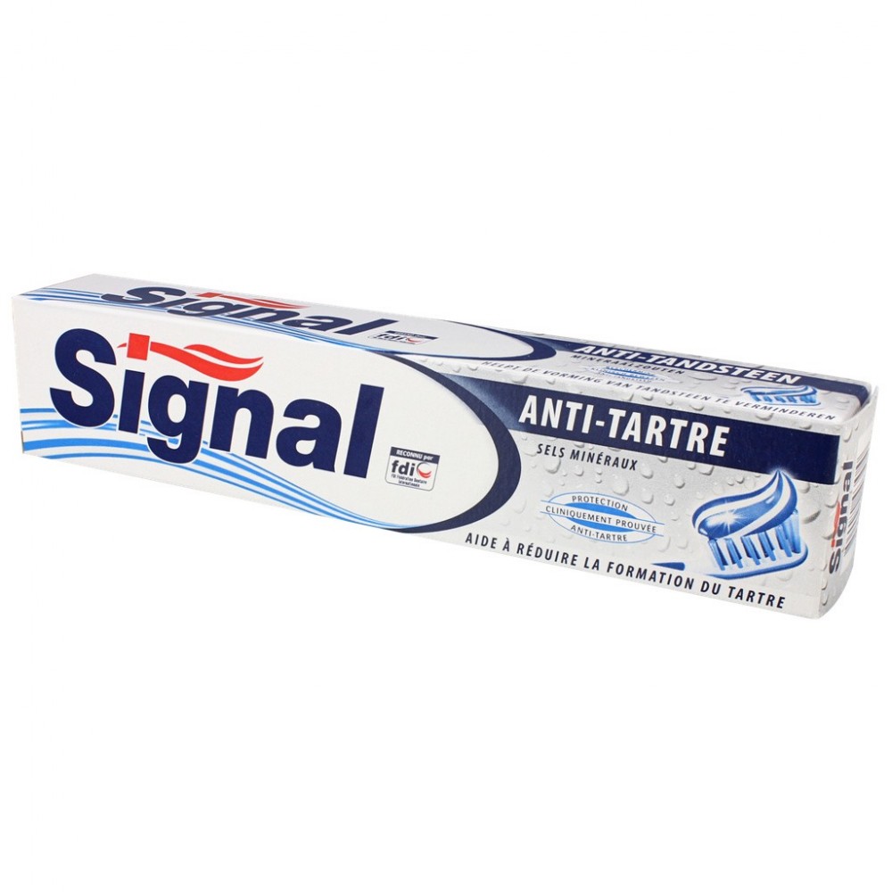 Le dentifrice Signal Anti-Tartre aux trois sels minéraux est cliniquement prouvé pour aider à réduire la formation du tartre. Ce dentifrice anti tartre prévient efficacement le tartre et les caries. Le tartre est la calcification de la plaque dentaire. Une fois formé, seul votre spécialiste dentaire peut l'enlever. Signal Anti-Tartre limite la formation de la plaque et freine la calcification. Il réduit la constitution du tartre et laisse les dents propres. Le fluor actif aide les dents à se reminéraliser en renforçant durablement la structure de l'émail et favorise ainsi la prévention des caries. Chez Signal, nous pensons que votre sourire est l'expression de votre personnalité et de votre confiance en vous. Notre mission : améliorer la santé bucco-dentaire de tous, pour que chacun d'entre nous libère le pouvoir de son sourire. Signal accompagne les Français depuis 1961 pour leur transmettre les bons gestes, dès le plus jeune âge et démontrer l'importance d'un brossage deux fois par jour, matin et soir. Attentifs à la protection de la planète, nous prenons des mesures pour limiter l'impact environnemental de nos produits. En partenariat avec TerraCycle®, nous avons lancé un programme de recyclage gratuit, pour donner une seconde vie à vos brosses à dents et vos tubes de dentifrice. Avec Signal, chaque sourire compte !