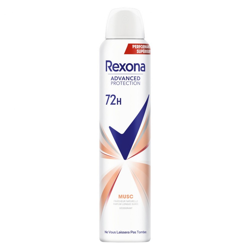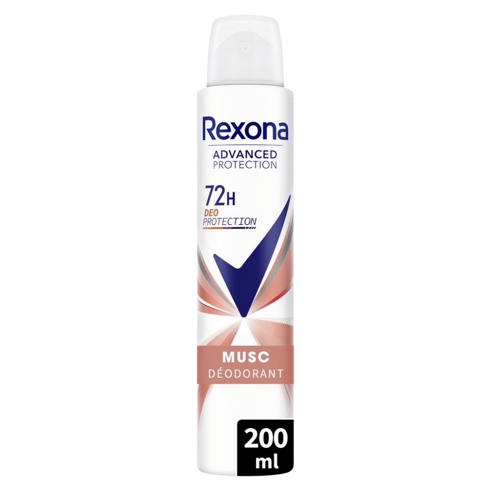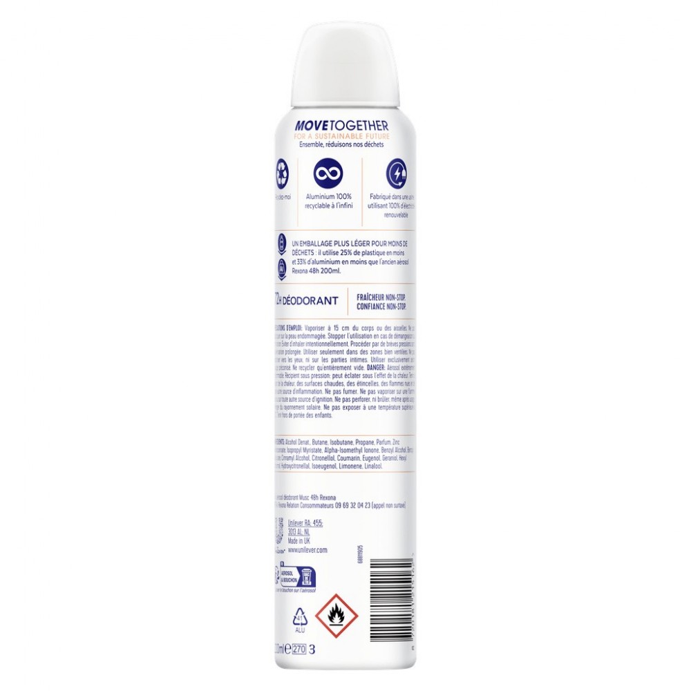 Restez fraîche toute la journée avec le déodorant spray femme Rexona Musc. En plus de vous protéger pendant 72 h contre les odeurs, sa formule laisse sur vos aisselles un parfum longue durée aux notes de musc, pour une confiance non-stop. Son format spray diffuse le produit sur la peau et offre un séchage rapide. Avec le déodorant Rexona Musc, vous vous sentez fraîche et protégée des mauvaises odeurs, du lever au coucher du soleil ! De plus, le flacon de ce déodorant est majoritairement recyclable, pensez au tri ! Ce spray femme a été fabriqué dans une usine utilisant 100 % d'électricité renouvelable. Jour après jour, les déodorants Rexona vous protègent et apportent fraîcheur et confort à chacun de vos mouvements. Le déodorant femme Rexona Musc vous est proposé au format 200 ml. Rexona est LA marque de l'efficacité. Ses produits ont été conçus pour en faire plus, tout comme vous. Escalader une montagne, prendre le bus, faire une présentation ou vous préparer pour votre premier rendez-vous : quoi qu'il arrive, vous pouvez compter sur l'efficacité Rexona. Nous nous appuyons sur notre longue expérience pour vous proposer des technologies anti-transpirantes exclusives, comme Body Heat Activated. Les molécules anti-transpirantes de la technologie brevetée Rexona s'organisent en un maillage serré pour réguler le flux de transpiration de façon ultra-efficace et vous offrent une haute performance durable. Rexona ne vous laissera jamais tomber. Technologie anti-transpirante brevetée et activée par la chaleur du corps pour 72 h de protection anti-transpirante. 72 h d'efficacité anti-humidité et anti-odeur non-stop. 0% alcool.