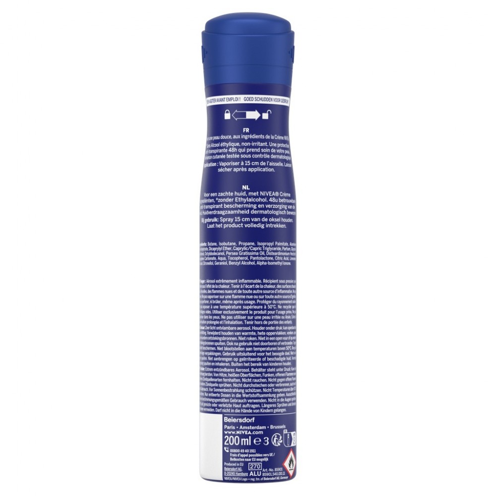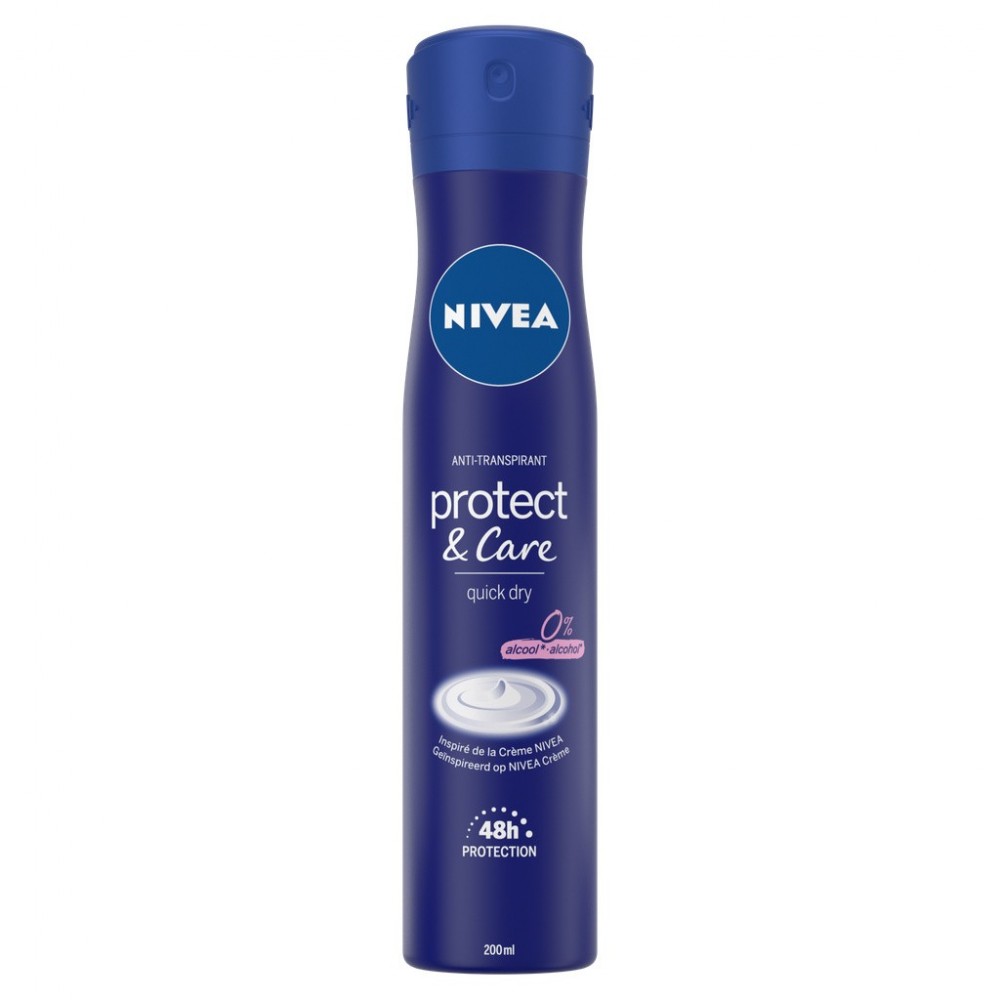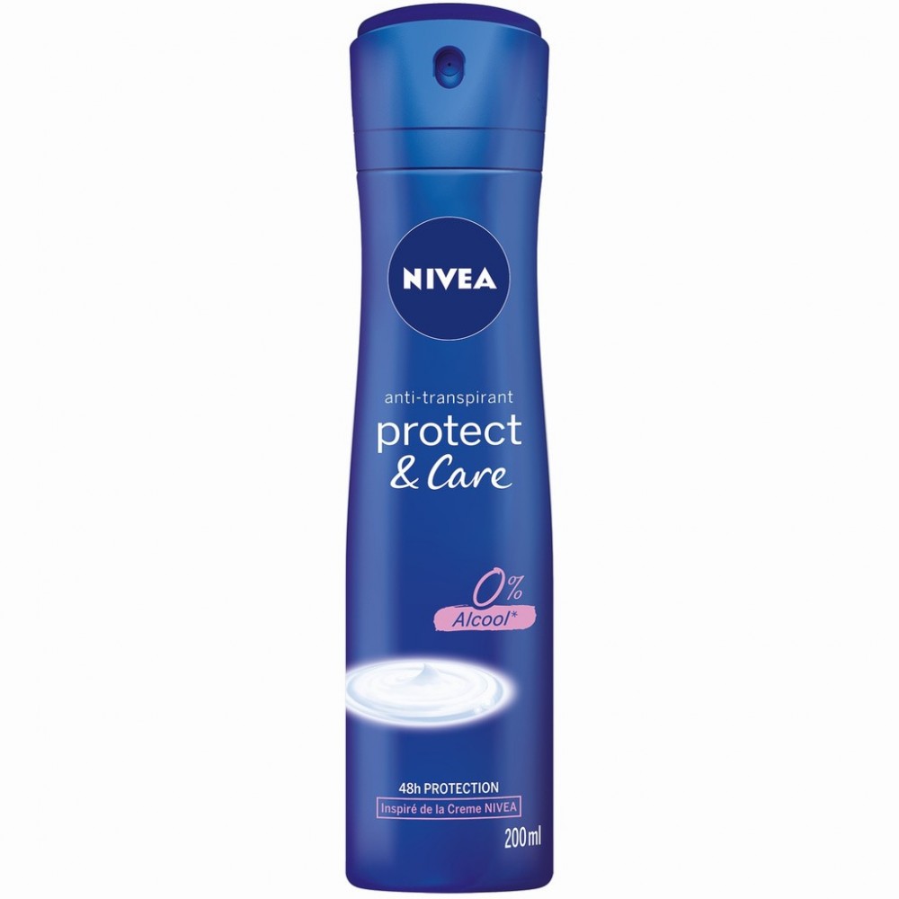 Avec son parfum familier inspiré de la NIVEA Crème, Le déodorant anti-transpirant Protect & Care éveille vos sens et prend soin de votre peau tout en douceur. Sa formule unique alliant soin et efficacité, vous assure une protection anti-transpirante pendant 48h. Pour des aisselles sèches et délicatement parfumé durablement ! Ce Déodorant est formulé sans alcool et à partir des ingrédients de la Crème emblématique NIVEA. Tolérance cutanée testée sous contrôle dermatologique, il n’irrite pas. Format spray 200ml. Existe aussi en format bille 50ml.
