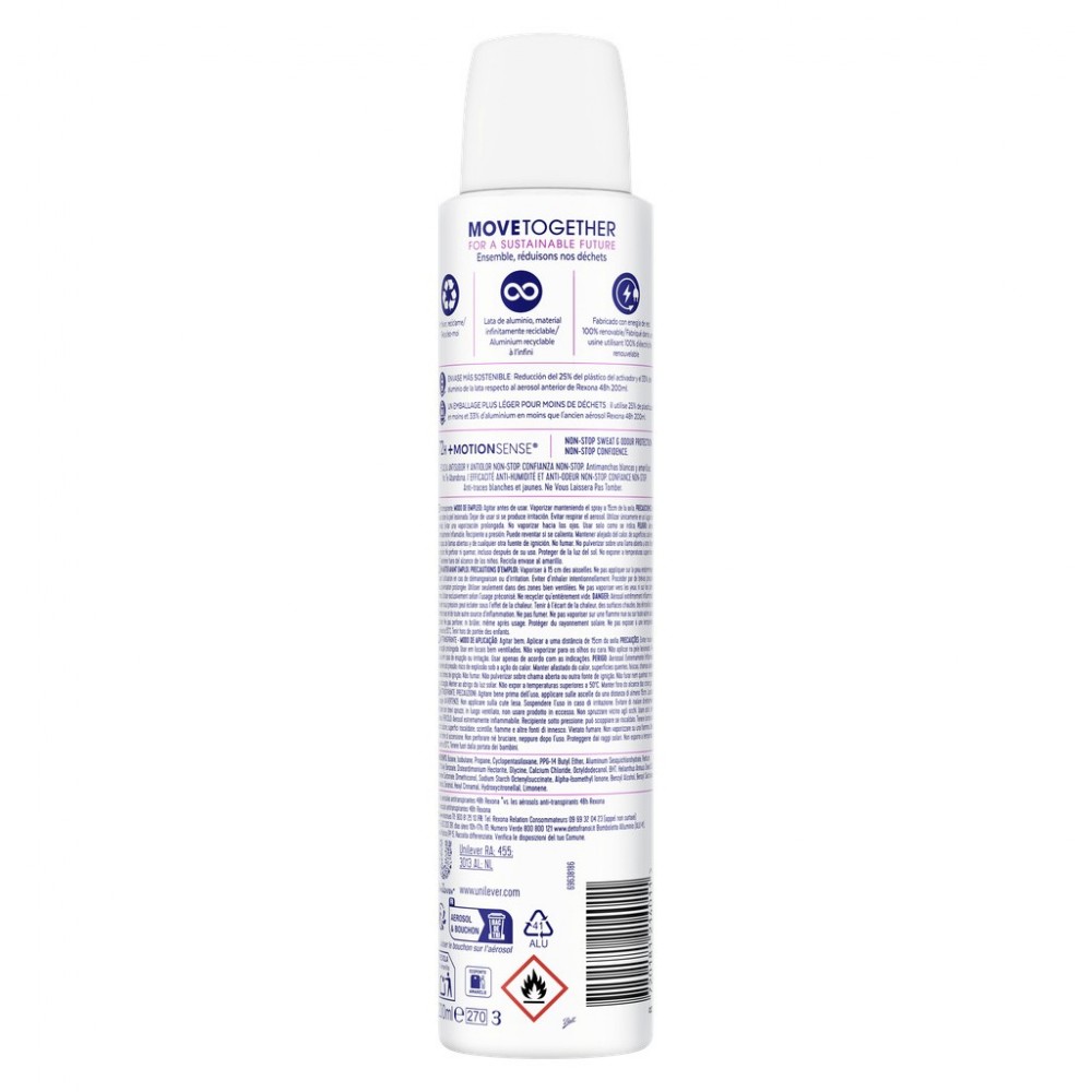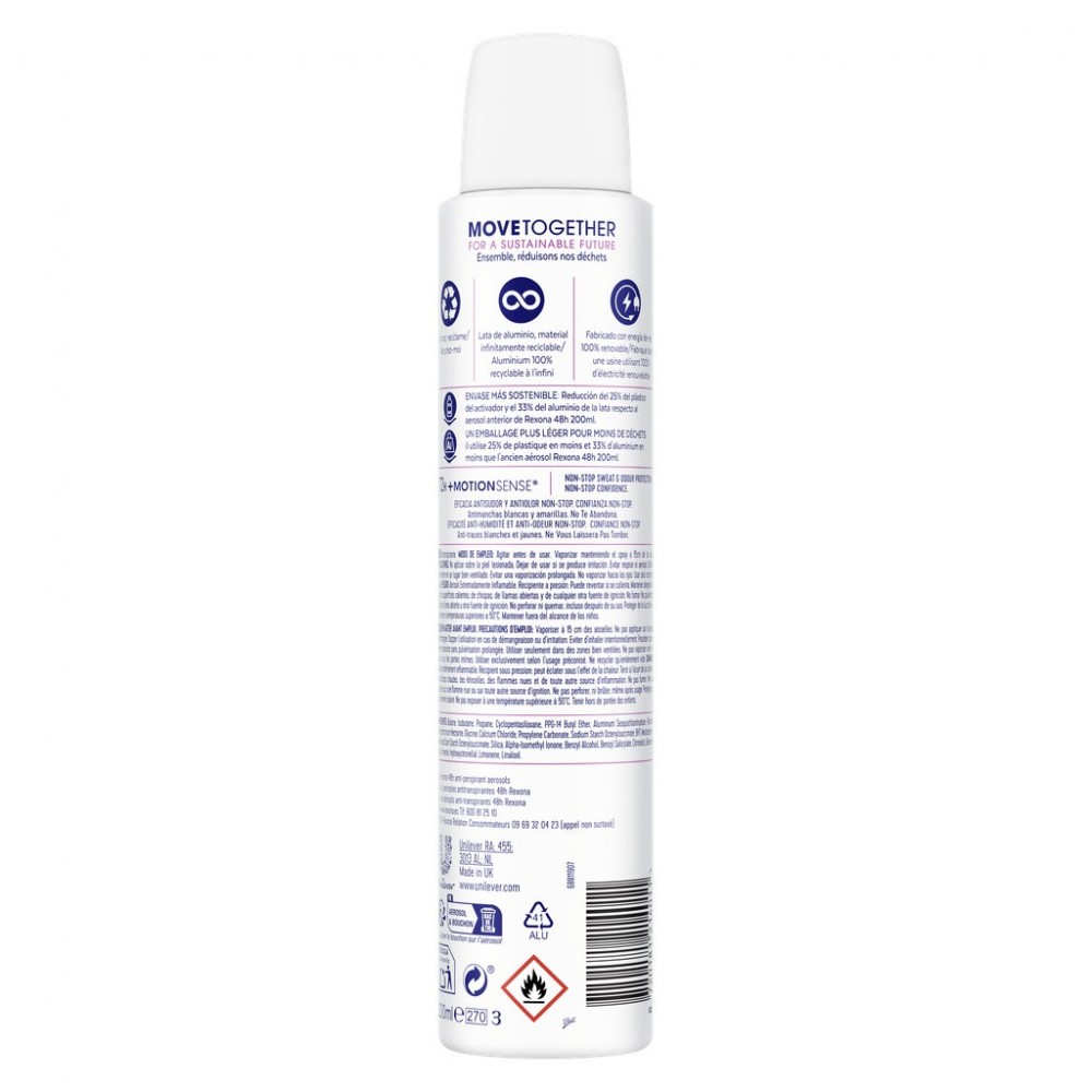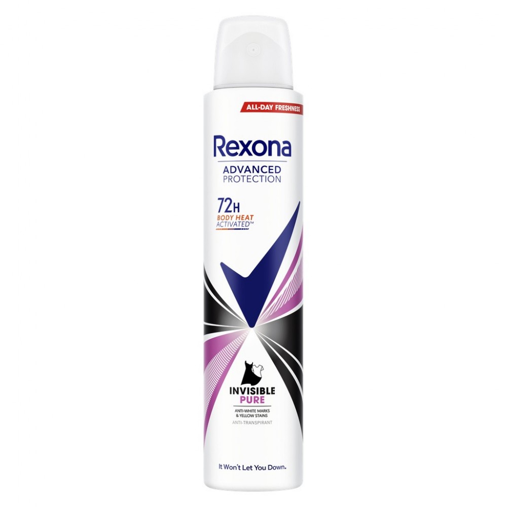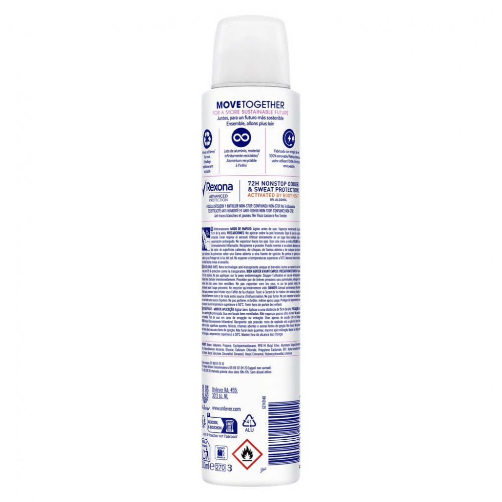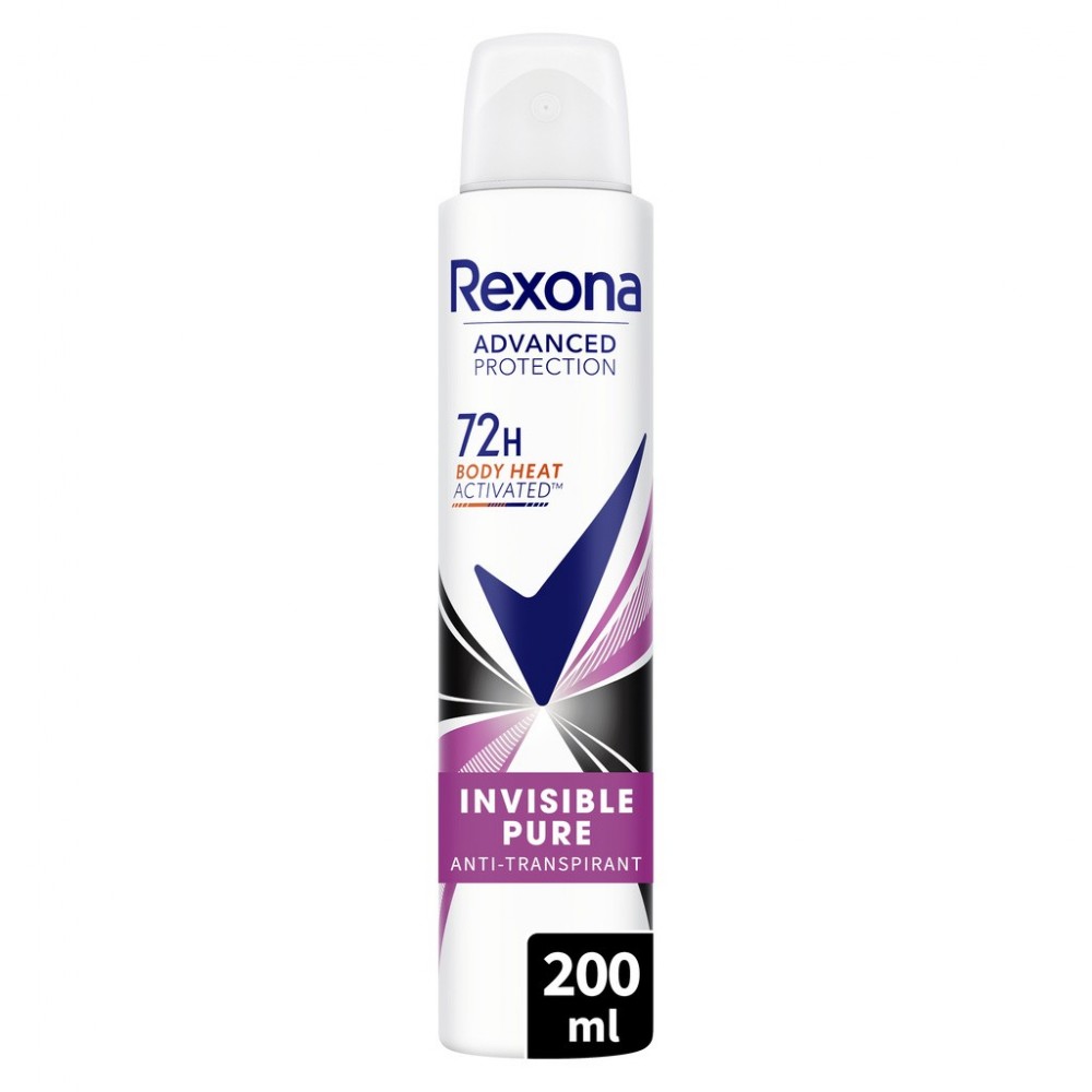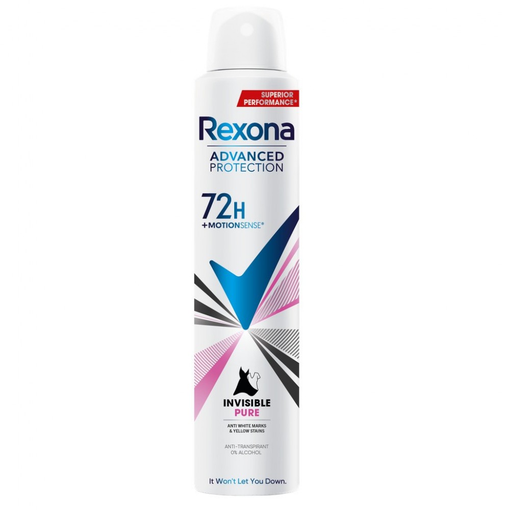 Le déodorant spray anti-transpirant Rexona Advanced Protection Invisible Pure contient une formule 0 % alcool* testée dermatologiquement qui offre 72 h de protection contre la transpiration et les odeurs, tout en protégeant contre les traces blanches sur vos vêtements noirs et contre les traces jaunes sur vos vêtements blancs, afin que vous soyez toujours à l'aise. Ce déodorant anti-transpirant emploie une technologie brevetée activée par la chaleur du corps, pour une confiance à toute épreuve. Il dégage un parfum frais, floral et légèrement fruité de rose, jasmin et agrumes. Que vous soyez en train d'encourager votre équipe préférée, de vous dépenser ou sur le point de rencontrer des amis, ce déodorant anti-transpirant en spray vous soutiendra en toutes circonstances. Lorsque vous travaillez dur, Rexona en fait tout autant. Mode d'emploi : Vaporiser à 15 cm des aisselles. Ne pas appliquer sur la peau endommagée. Stopper l'utilisation en cas de démangeaison ou d'irritation. Éviter d'inhaler intentionnellement. Procéder par de brèves pressions sans pulvérisation prolongée. Utiliser seulement dans des zones bien ventilées. Ne pas vaporiser sur les yeux, ni sur les parties intimes. Utiliser seulement selon l'usage préconisé. Ne recycler qu'entièrement vide. Les produits Rexona se déclinent également en une variété de parfums frais. Les déodorants anti-transpirants sont aussi disponibles en spray compressé, en stick ou au format à bille. Parfait en toute situation. Notre mission est de donner à chacun l'inspiration de dépasser ses limites en toute confiance. En plus d'augmenter notre utilisation de matériaux recyclables, nous faisons en sorte de faciliter le recyclage des emballages de nos déodorants en spray, en stick ou à bille en les rendant majoritairement recyclables. Agissons ensemble pour un futur plus durable. Rexona ne vous laissera pas tomber. *Alcool éthylique