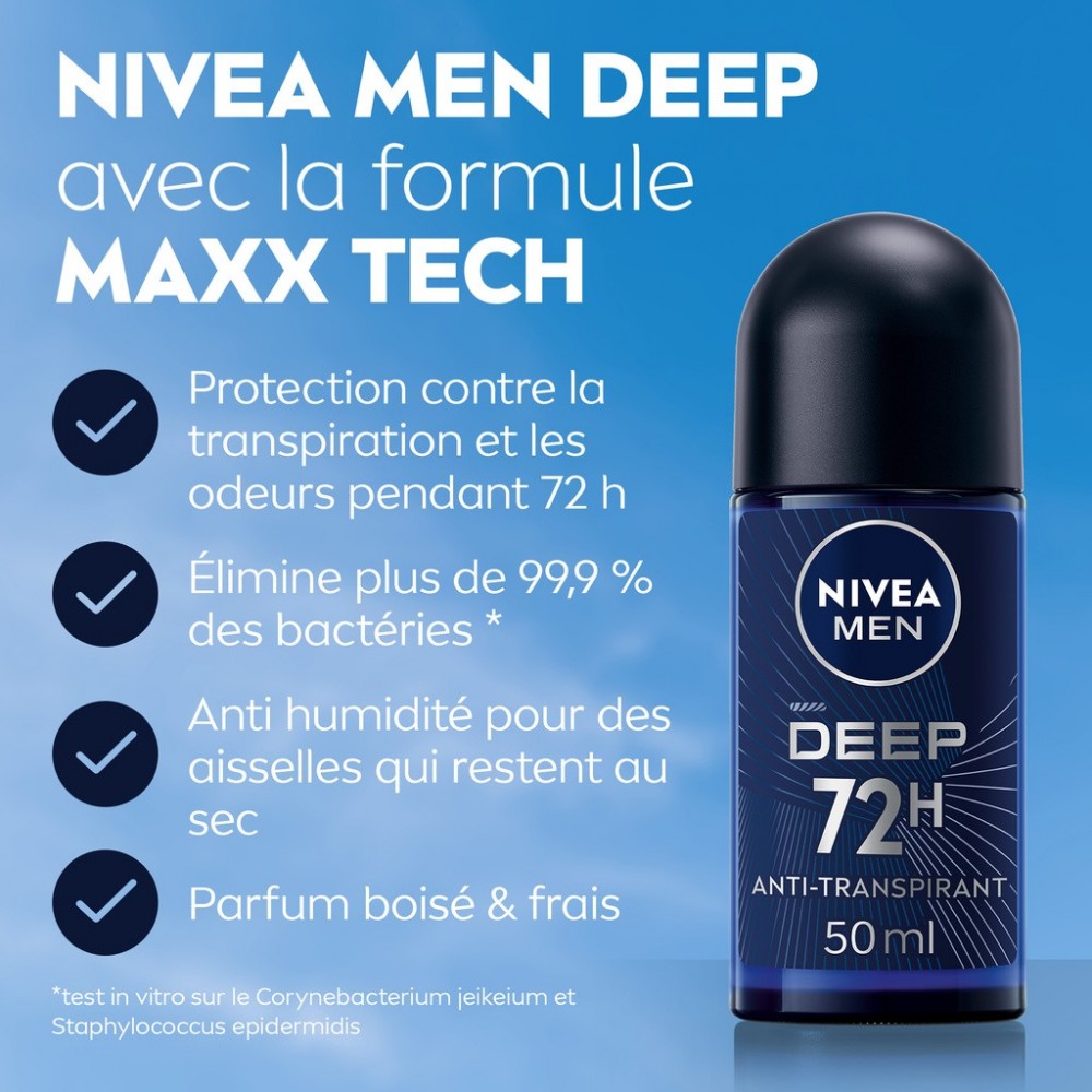 Déodorant Bille Homme Anti-transpirant 72H Deep NIVEA MEN le roll-on de 50ml