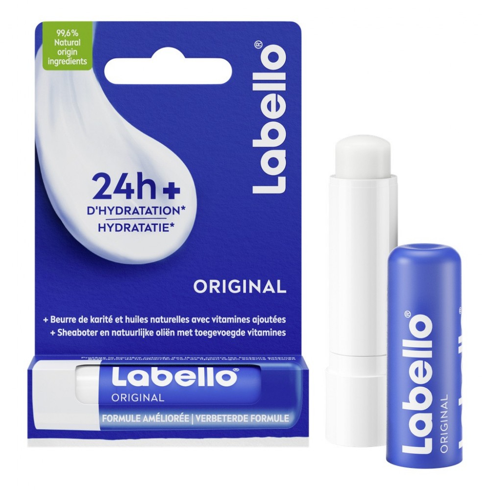 Le Labello® Original garde vos lèvres douces et hydratées pendant 24 heures*. Sa formule à base de beurre de karité et d'huiles naturelles enrichies en vitamines C & E est composée à 99,6 % d'ingrédients d'origine naturelle. Ultra nourrissant ce baume réparateur à la formule riche protègera vos lèvres du dessèchement et gardera vos lèvres lisses et souples toute la journée. Sa formule unique a une texture onctueuse qui fond instantanément sur vos lèvres et ne laisse aucun fini désagréable. Tolérance cutanée testée sous contrôle dermatologique. Il est idéal pour chouchouter vos lèvres toute la journée!