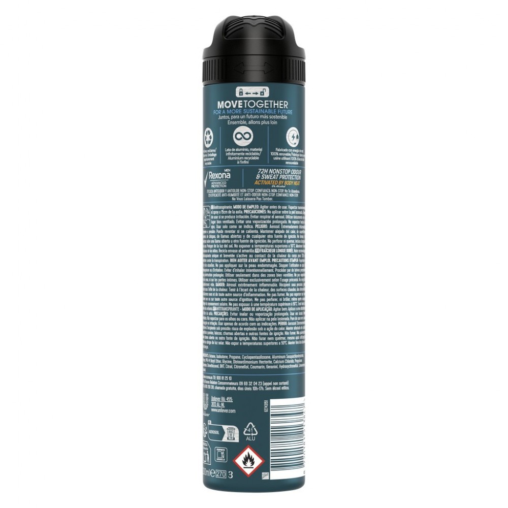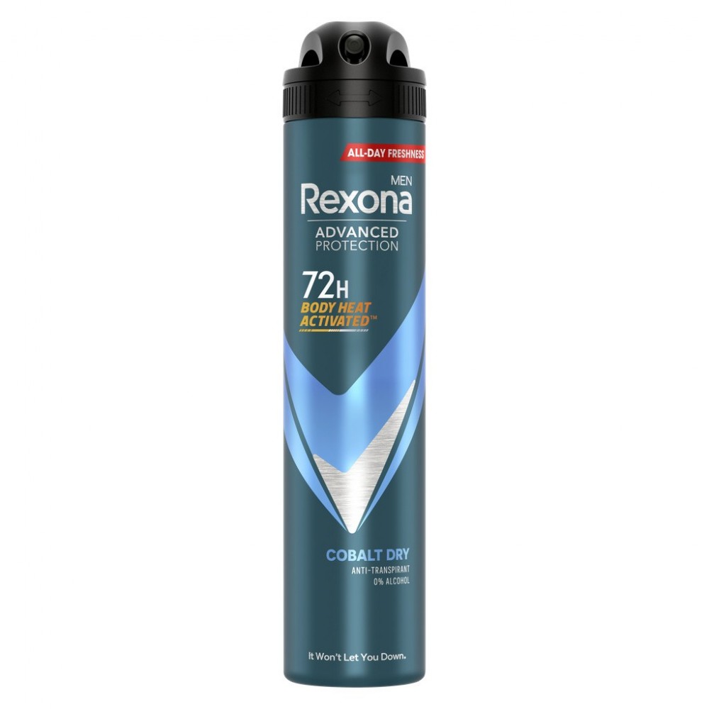 Le déodorant spray anti-transpirant Rexona Men Advanced Protection Cobalt Dry offre 72 h de protection contre la transpiration et les odeurs. Sa formule 0 % alcool* et testée dermatologiquement laisse vos aisselles propres toute la journée sans causer d'irritation. La technologie anti-transpirante brevetée de ce déodorant est activée par la chaleur du corps, pour 72 h de confiance et une protection qui s'adapte à votre corps. Il dégage également un parfum frais de glace et de menthe. Mode d'emploi : Vaporiser à 15 cm des aisselles. Ne pas appliquer sur la peau endommagée. Éviter d'inhaler intentionnellement. Procéder par brèves pressions sans pulvérisation prolongée. Utiliser seulement dans des zones bien ventilées. Ne pas vaporiser vers les yeux, ni sur les parties intimes. Utiliser exclusivement selon l'usage préconisé. Ne recycler qu'entièrement vide. Les produits Rexona se déclinent également en une variété de parfums frais. Les déodorants anti-transpirants sont aussi disponibles en spray compressé, en stick ou au format à bille. Parfait en toute situation. Notre mission est de donner à chacun l'inspiration de dépasser ses limites en toute confiance. En plus d'augmenter notre utilisation de matériaux recyclables, nous faisons en sorte de faciliter le recyclage des emballages de nos déodorants en spray, en stick ou à bille en les rendant majoritairement recyclables. Agissons ensemble pour un futur plus durable. Rexona ne vous laissera pas tomber. *Alcool éthylique
