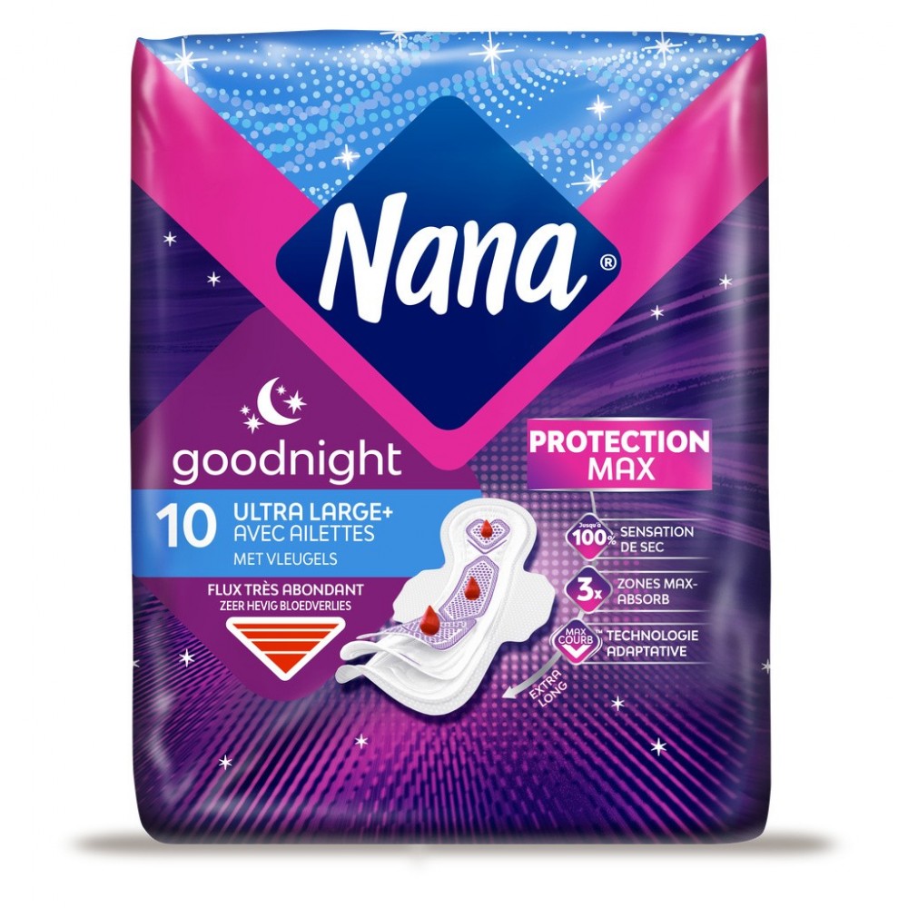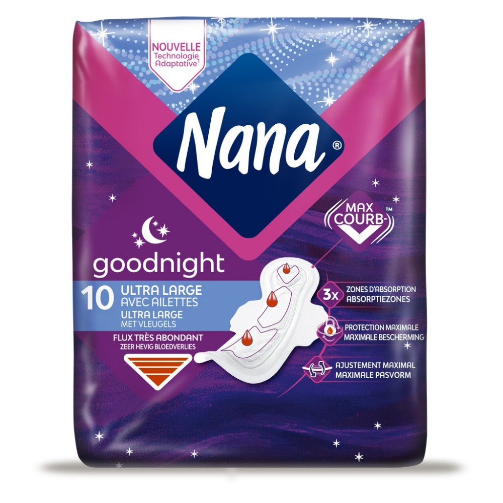 Profitez d’une Protection Maximale et dormez sereinement dans toutes les positions grâce aux serviettes Nana Goodnight Ultra Large. Ses 3 zones Max-Absorb capturent et retiennent rapidement le sang dans son coeur absorbant, spécialement conçu pour les règles abondantes. Profitez jusqu’à 100% de sensation au sec*. Et découvrez un ajustement sans pareil avec la technologie adaptative Courb-V™ , dotée d’un coeur courbé unique qui épouse toutes les formes. _x000D_