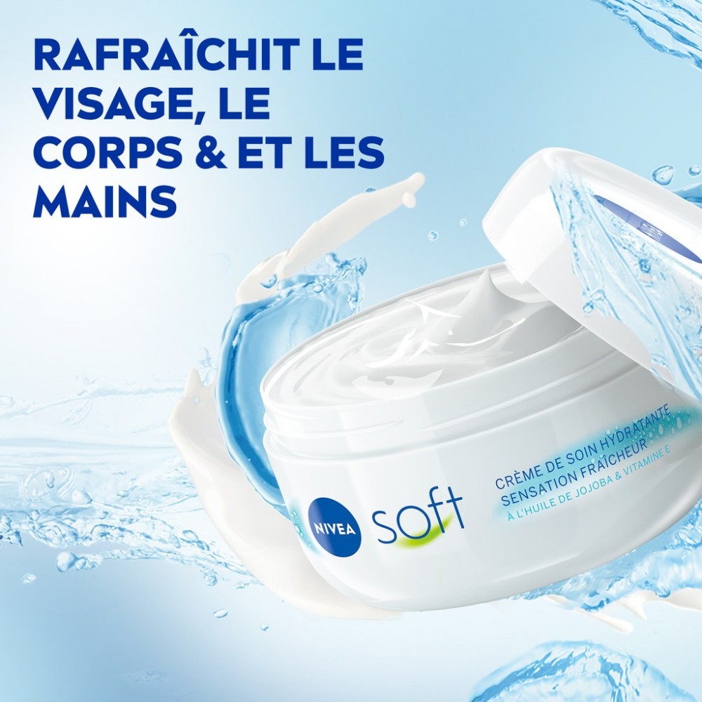 NIVEA Soft est une crème enrichie en Huile de Jojoba 100 % naturelle, connue pour ses propriétés hydratantes et adoucissantes, et en Vitamine E, antioxydante qui vient protéger la structure naturelle de la peau. Elle hydrate intensément votre corps, votre visage et vos mains pendant 48h (Mesure instrumentale, 47 participants)et elle est adapté à tous les types de peaux, même les plus sèches. Dès la première application, sa formule pénètre rapidement grâce à sa texture légère. Elle laisse une sensation de fraîcheur et rend votre peau douce, souple et satinée. C'est le soin idéal pour une utilisation quotidienne. Testé sous contrôle dermatologique.
