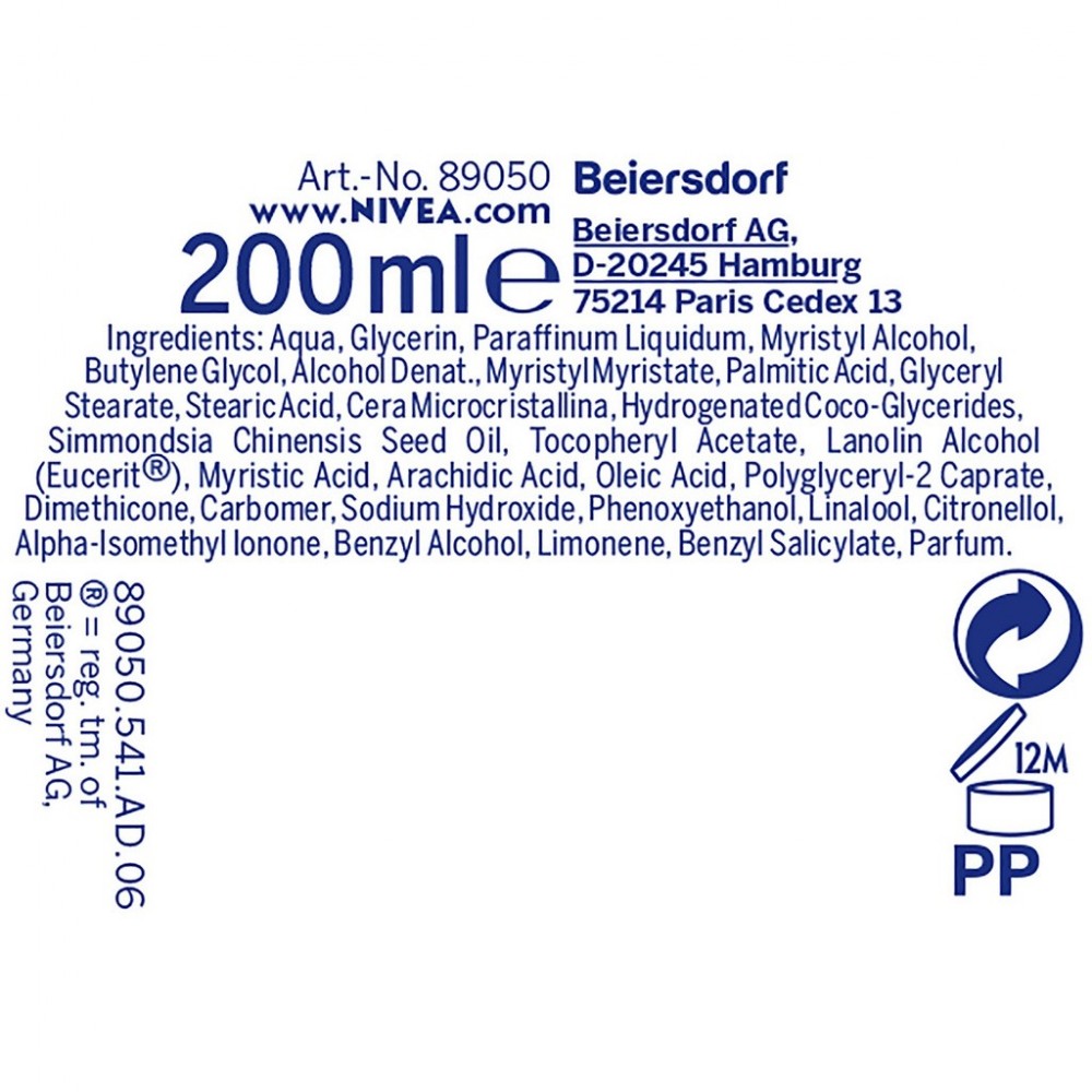 ingrédients: Aqua, Glycerin, Myristyl Alcohol, Alcohol Denat, Myristyl Myristate, Cetearyl Glucoside, Coco-Caprylate/Caprate, Glyceryl Stearate, Palmitic Acid, Stearic Acid, Hydrogenated Coco-Glycerides, Simmondsia Chinensis Seed Oil, Tocopheryl Acetate, Prunus Amygdalus Dulcis Oil, Vegetable Oil, Cetyl Ricinoleate, Triisostearin, Sorbitan Stearate, Hydroxypropyl Starch Phosphate, Sodium Hydroxide, Cetearyl Alcohol, Gellan Gum, Xanthan Gum, Myristic Acid, Arachidic Acid, Oleic Acid, Lauric Acid, Disodium Cetearyl Sulfosuccinate, Phenoxyethanol, Linalool, Citronellol, Alpha-Isomethyl Ionone, Acetyl Cedrene, Citrus Aurantium Peel Oil, Limonene, Terpineol, Lavandula Oil/Extract, Linalyl Acetate, Parfum