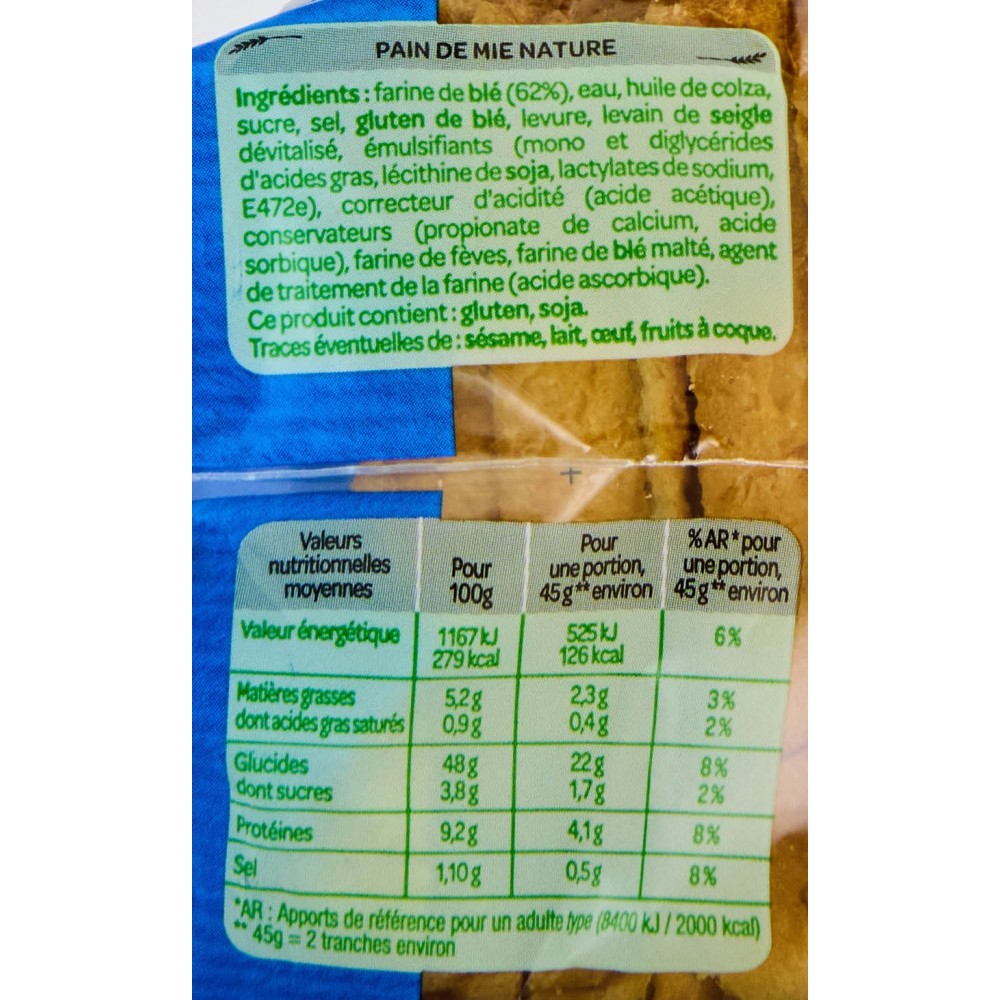 Farine de blé (62%), eau, huile de colza, sucre, sel, gluten de blé, levure, levain de seigle dévitalisé, émulsifiants ( mono et diglycérides gras, lécithine de soja, lactylates de sodium, E472e), correcteur d'acidité (acide acétique), conservateurs (propionate de calcium, acide sorbique), farine de fèves, farine de blé malté, agent de traitement de la farine (acide ascorbique)