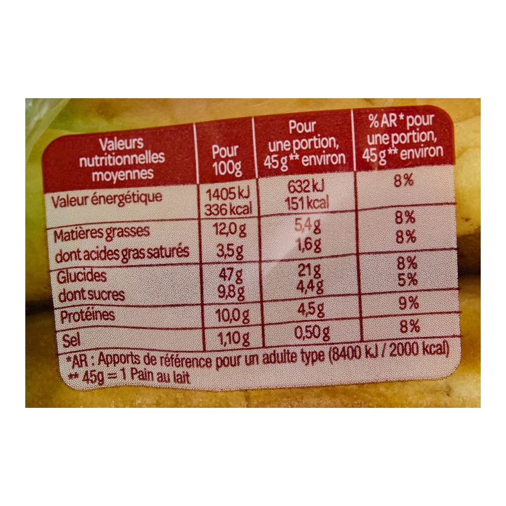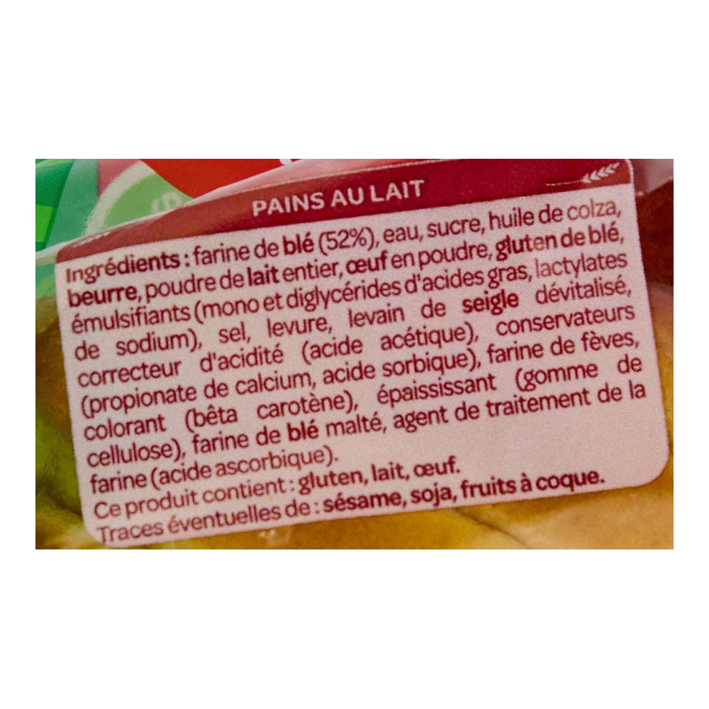 Farine de blé (52%),e au, sucre, huile de colza, beurre, poudre de lait entier, oeuf en poudre, glutende blé, émulsifiants (mono- et diglycérides d'acides gras, lactylats de sodium), sel, levure, levain de seigle dévitalisé, correcteur d'acidité (acide acétique), conservateurs (propionate de calcium, acides sorbique), farine de fèves, colorant (bêta carotène), épaississant (gomme de cellulose), farine de blé malté, agent de traitement de la farine (acide ascortique)