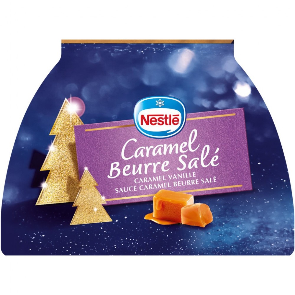 Glace au caramel aromatisée, crème glacée à la vanille, sauce au caramel au beurre salé (8%) et morceaux de caramel au beurre salé enrobés de beurre de cacao (4%)