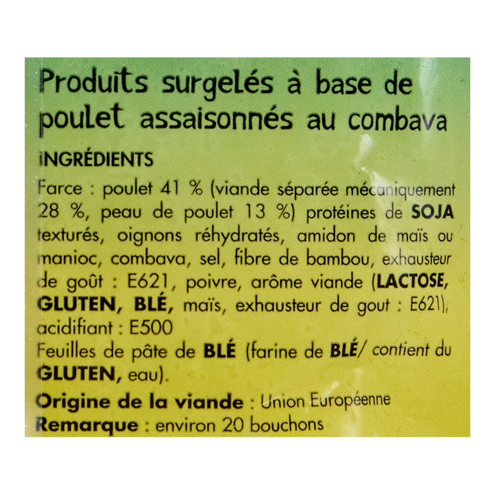 Farce poulet 41% ( viande séparée mécaniquement 28 % peau de poulet 13% ) protéine de Soja texturés, oignon réhydratés, amidon de mais ou manioc, combava , sel , fibre,de bambou, exhausteurde gout : E621, ,poivre, arome viande ( LACTOSE ; GLUTEN, eau ;)