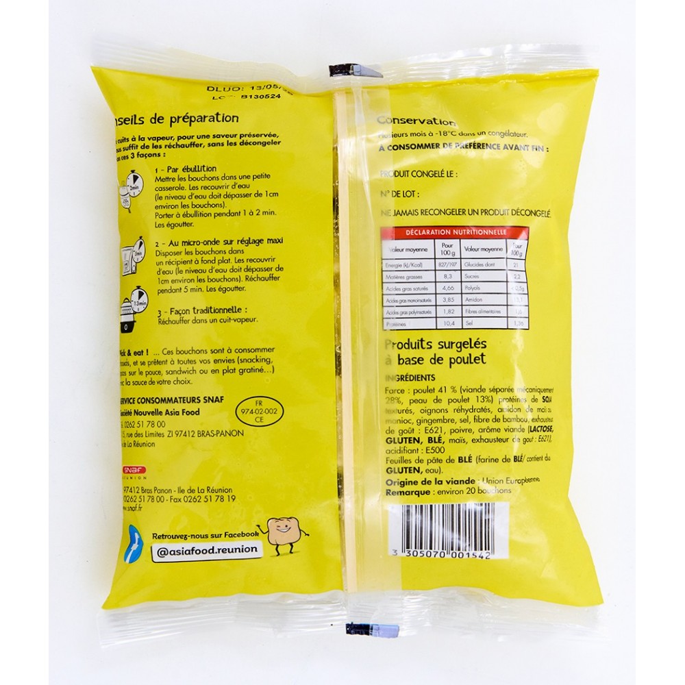 Farce : Poulet 41% ( Viande séparée mecaniquement 28% peau de poulet 13 % ) Protéines manioc Soja texturés , oignons réhydratés, amidon de mais ou manioc , gingembre, sel , fibre de bambou, exhausteur de gout:: E621 , poivre , arome viande ( LACTOSE, GLUTEN , BLE mais , EXhausteur de gout : E621) acidifiant : E500 Feuille de pate de blé 5 Farine de blé/ contient GLUTEN , EAU )