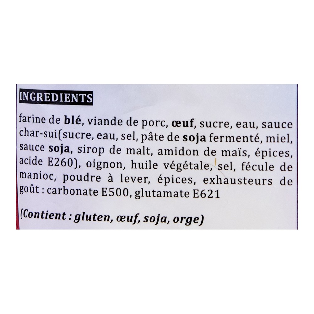 Farine de blé, viande de porc, oeuf, sucre, eau, sauce char-sui (sucre, eau, sel, pâte de soja fermenté, miel, sauce soja, sirop de malt