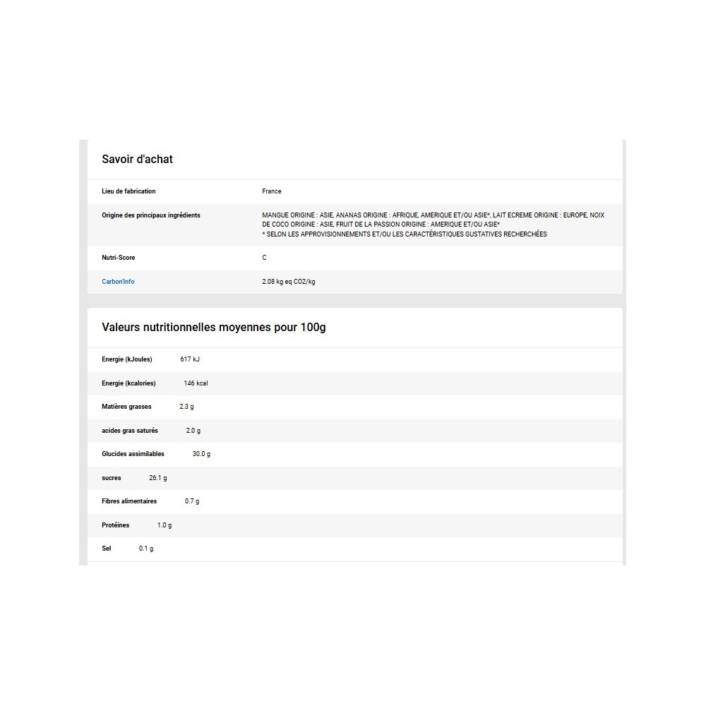 Ingrédients : eau ; sucre ; purée de mangue 10,8 % ; jus d'ananas à base de concentré 10,6 % ; lait écrémé réhydraté ; sirop de glucose ; poudre de lait de noix de coco 2,4 % (lait de noix de coco, maltodextrine, caséinate de sodium (lait)) ; poudre de lactosérum ; noix de coco râpée 1 % ; émulsifiant : E471 ; gélifiants : farine de graines de caroube, gomme guar, pectines, gomme xanthane, gomme Tara ; jus de fruit de la passion concentré 0,4 % ; jus de citron concentré ; arôme naturel d’ananas ; arôme naturel de noix de coco ; protéines de pois hydrolysées ; concentré de carotte ; acidifiant : acide citrique ; concentré de carthame ; arôme naturel de mangue ; colorant : caroténoïdes ; arôme naturel de fruit de la passion.