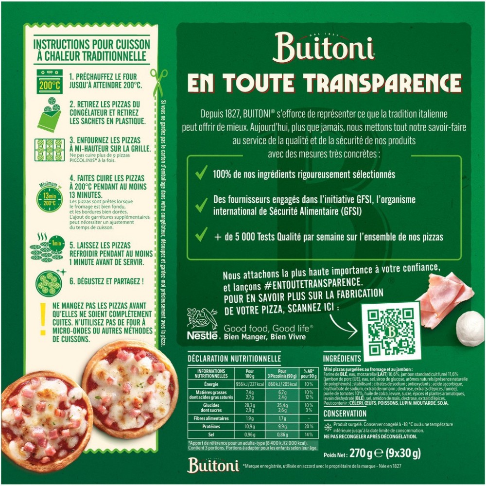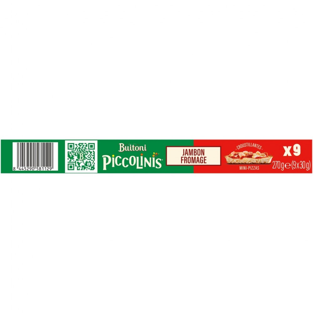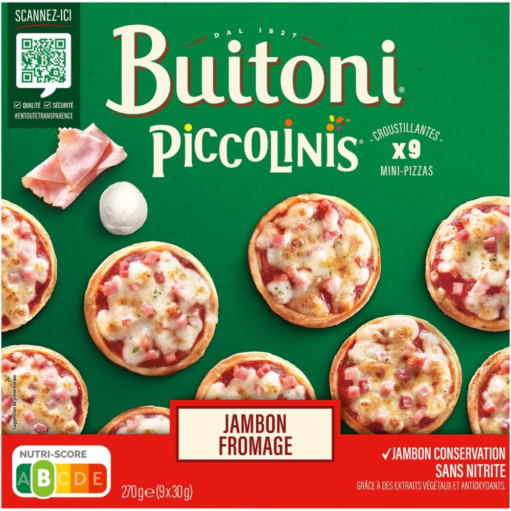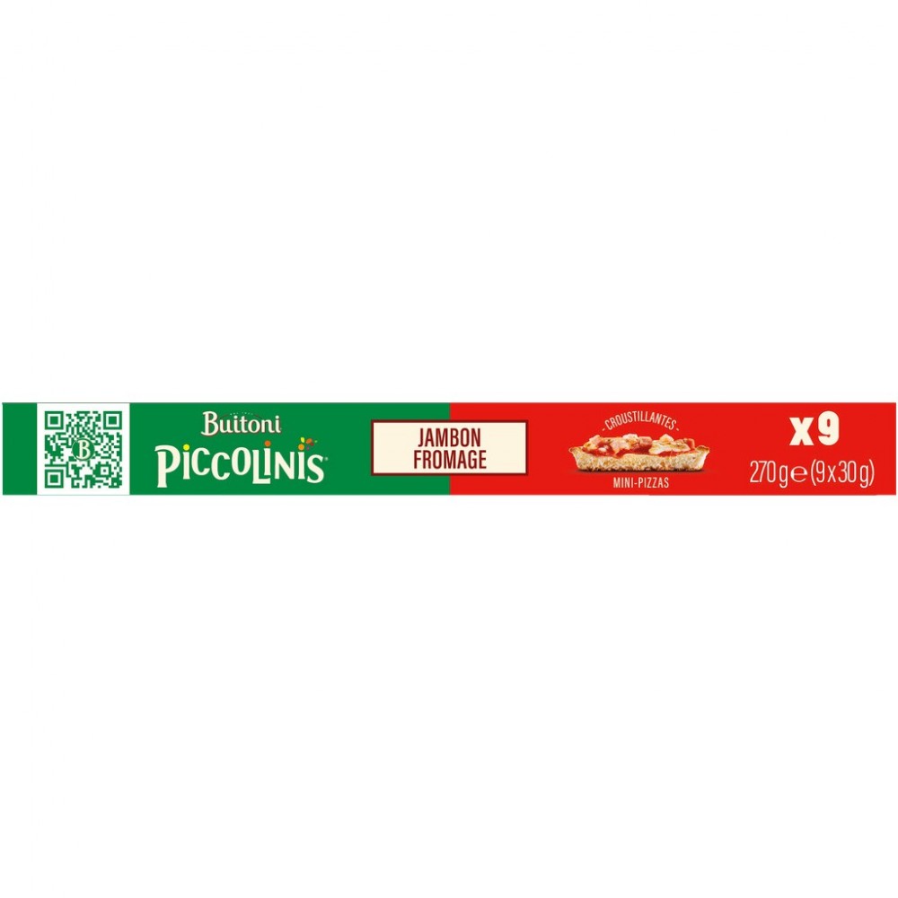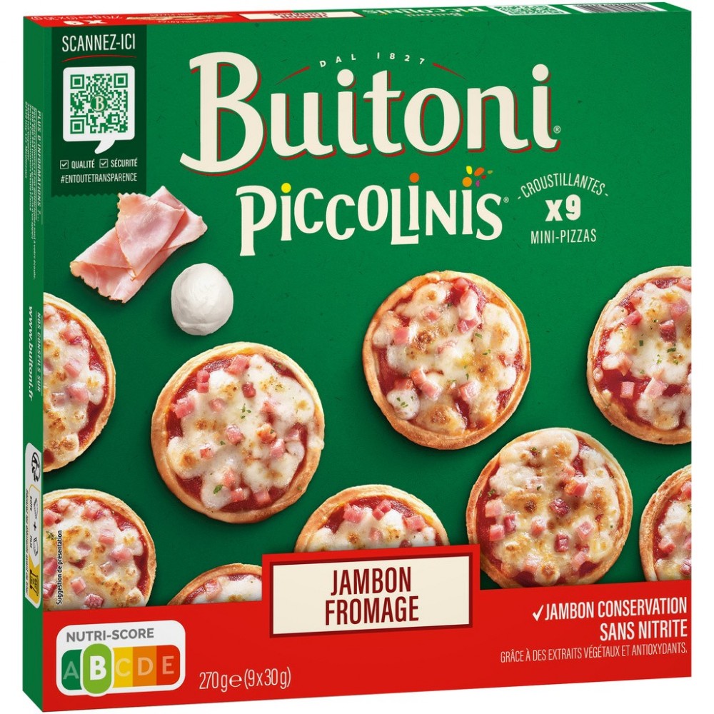 Laissez-vous tenter par les mini-pizzas PICCOLINIS de BUITONI : des petites pizzas surgelées, à la pâte croustillante et à la garniture généreuse ! Gourmandes, savoureuses et prêtes en quelques minutes seulement. Ces mini-pizzas sont composées de mozzarella généreuse et de petits morceaux de jambon ! BUITONI s'engage en toute transparence. Aujourd'hui, plus que jamais, nous mettons tout notre savoir faire au service de la qualité et de la sécurité de tous nos produits. Plus d'informations sur Buitoni.fr