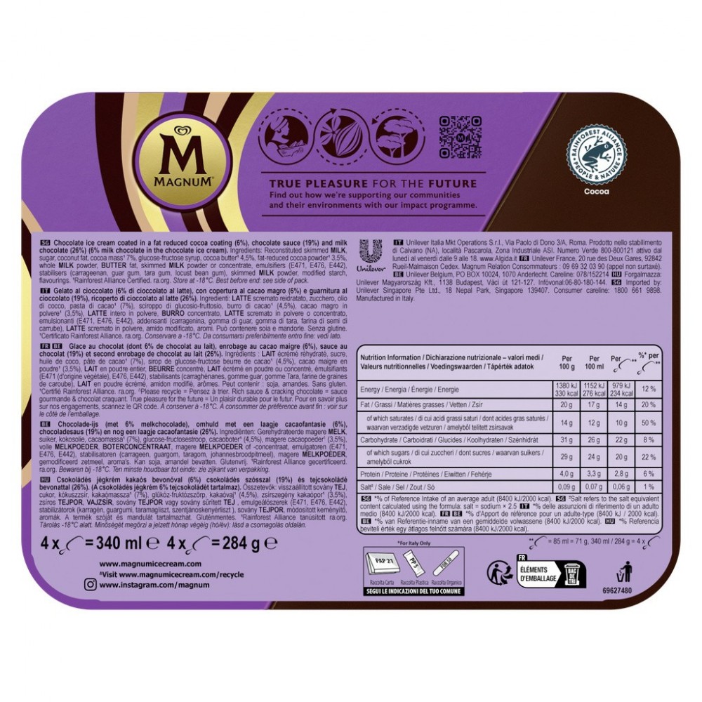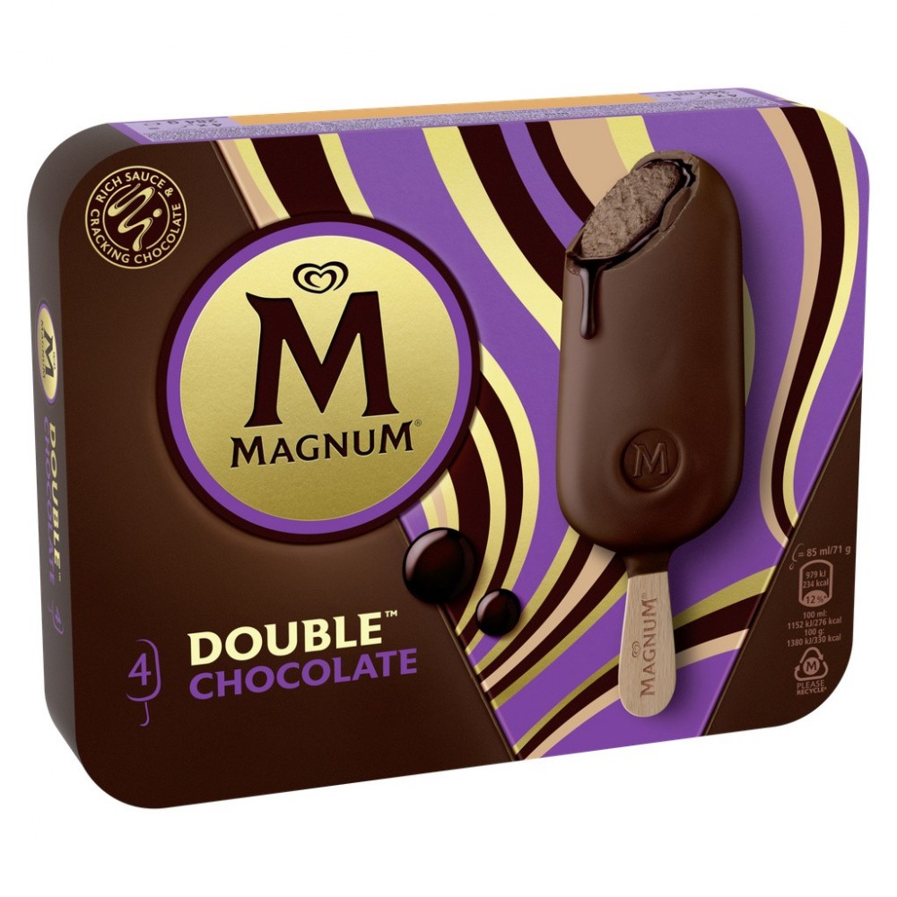 Magnum Double Chocolat est une glace chocolat onctueuse dans un premier enrobage de cacao accompagné d'une sauce au chocolat et un second enrobage au chocolat au lait. Retrouvez le croquant Magnum dès la première bouchée, un savoureux enrobage de chocolat au lait qui dévoile une délicieuse glace. Une forme emblématique, irrésistiblement craquante à l'extérieur, onctueuse à l'intérieur. Pour profiter pleinement de leurs saveurs, sortez vos glaces Magnum du congélateur quelques minutes avant de les déguster. Magnum voit le jour en 1989 afin de satisfaire un désir de gourmandise activement recherché par les adultes. Le bâtonnet se pare alors d'un enrobage au chocolat de grande qualité. Depuis, Magnum ne cesse de surprendre en élargissant chaque année son offre de nouveaux parfums. Aujourd'hui leader sur le marché de la glace, la marque offre une expérience toujours plus intense et premium. Les créations Magnum ? Irrésistibles de l'extérieur, onctueuses à l'intérieur, aussi savoureuses qu'intemporelles, elles ont su traverser les modes et s'imposer comme des saveurs incontournables. Leur signature ? Une forme emblématique, des parfums synonymes de plaisir et ce fameux chocolat craquant incomparable, qui n'a jamais failli à ses délicieuses promesses ! À redécouvrir et à savourer, encore et toujours. Magnum, fidèle au plaisir.