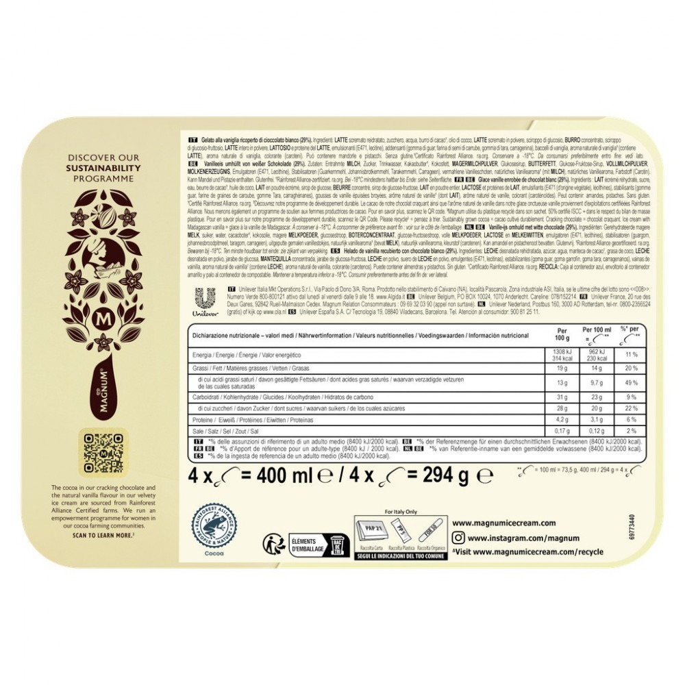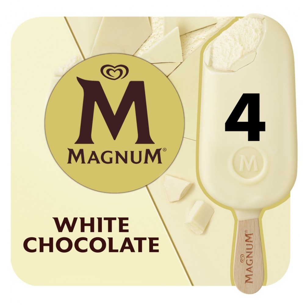 Magnum Chocolat Blanc est une onctueuse glace vanille enrobée d'un chocolat blanc craquant qui saura ravir vos papilles. Retrouvez le croquant Magnum dès la première bouchée, un enrobage chocolat blanc à la saveur inégalée qui dévoile une glace onctueuse. Parfum historique et emblématique de Magnum, ce bâtonnet gourmand Magnum Chocolat Blanc est un incontournable dans l'univers de la glace depuis plus de 25 ans. Une expérience de plaisir intense pour les adeptes du chocolat blanc. Pour profiter pleinement de leurs saveurs, sortez vos glaces Magnum du congélateur quelques minutes avant de les déguster. Magnum voit le jour en 1989 afin de satisfaire un désir de gourmandise activement recherché par les adultes. Le bâtonnet, un format jusque-là plutôt réservé aux enfants, se pare alors d'un enrobage au chocolat de grande qualité. Depuis, Magnum ne cesse de surprendre en élargissant chaque année son offre de nouveaux parfums. Aujourd'hui leader sur le marché de la glace, la marque offre une expérience toujours plus intense et premium. Les créations Magnum ? Irrésistibles de l'extérieur, onctueuses à l'intérieur, aussi savoureuses qu'intemporelles, elles ont su traverser les modes et s'imposer comme des saveurs incontournables. Leur signature ? Une forme emblématique, des parfums synonymes de plaisir à l'état pur et ce fameux chocolat craquant incomparable, qui n'a jamais failli à ses délicieuses promesses ! À redécouvrir et à savourer, encore et toujours. Magnum, fidèle au plaisir.