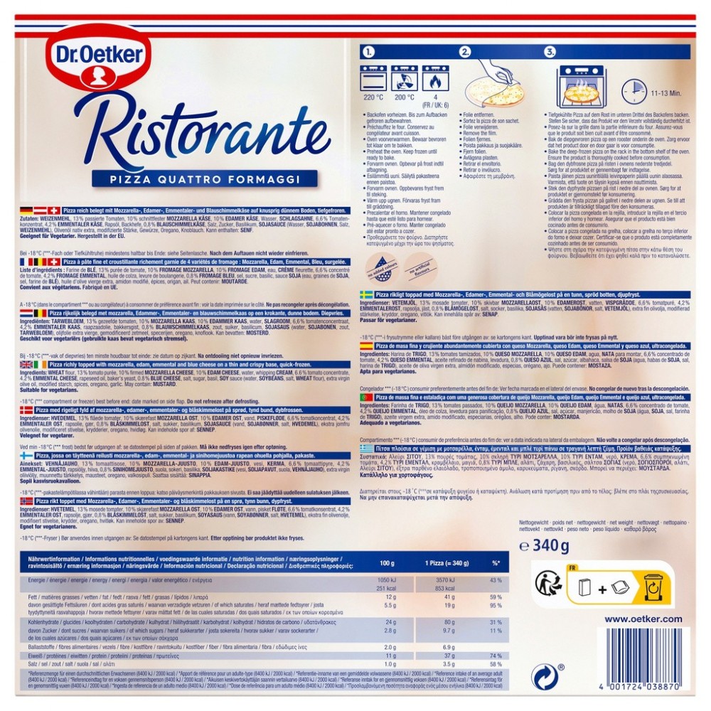 Savourez la pizza Ristorante Quattro Formaggi. Une pâte toujours fine et croustillante, légèrement irrégulière généreusement garnie de 4 fromages différents : l’Edam doux, l’Emmental, le Bleu relevé au persil et la Mozzarella. Un assortiment raffiné et irrésistible, disposé sur une couche de sauce tomate cuisinée. Nutriscore C.